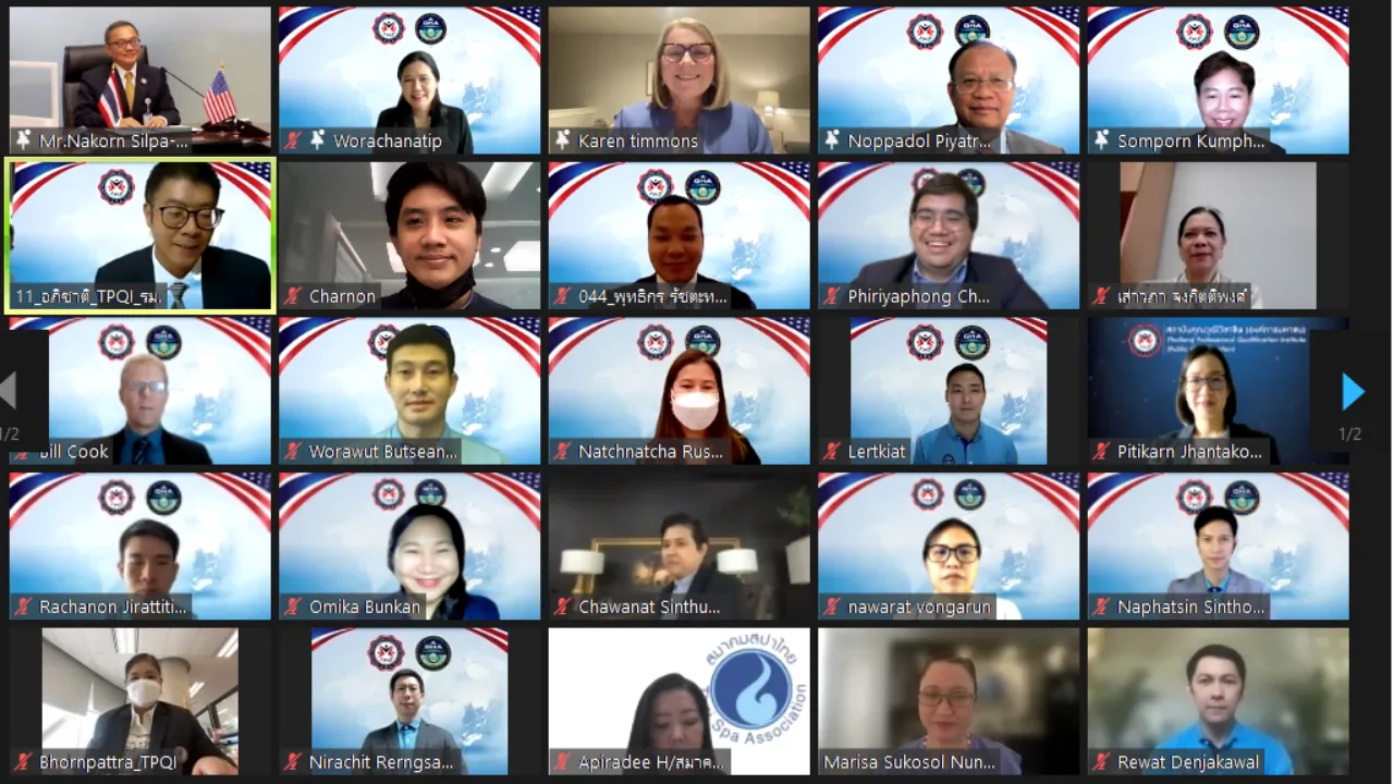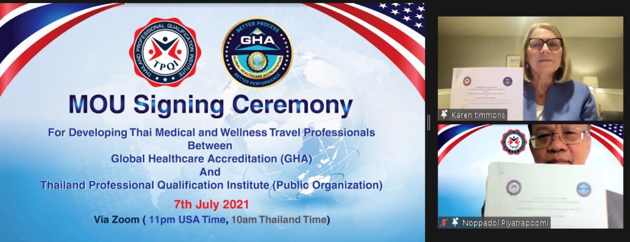 วันที่ 7 ก.ค. ดร.นพดล ปิยะตระภูมิ ผู้อำนวยการสถาบันคุณวุฒิวิชาชีพ ร่วมกับ Ms. Karen H. Timmons, Chief Executive Officer จาก Global Healthcare Accreditation (GHA) สหรัฐอเมริกา ลงนามบันทึกข้อตกลงความร่วมมือ “For Developing Thai Medical and Wellness Travel Professionals” หรือ การร่วมกันพัฒนาองค์ความรู้เกี่ยวกับการให้บริการด้านการท่องเที่ยวเชิงการแพทย์และสุขภาพ ผ่าน Video Conference ตรงจากประเทศสหรัฐอเมริกา โดยมี นายนคร ศิลปอาชา ประธานกรรมการสถาบันฯ พร้อมนางสาววรชนาธิป จันทนู, นางสาวจุลลดา มีจุล, นายพงศ์พัฒน์ เทียนศิริ รองผู้อำนวยการสถาบันฯ และคณะผู้บริหารสถาบันฯ รวมไปถึง นายแพทย์สมพร คำผง ตัวแทนฝ่ายบริหาร GHA ประเทศไทยพร้อมคณะ ร่วมกันเป็นสักขีพยาน