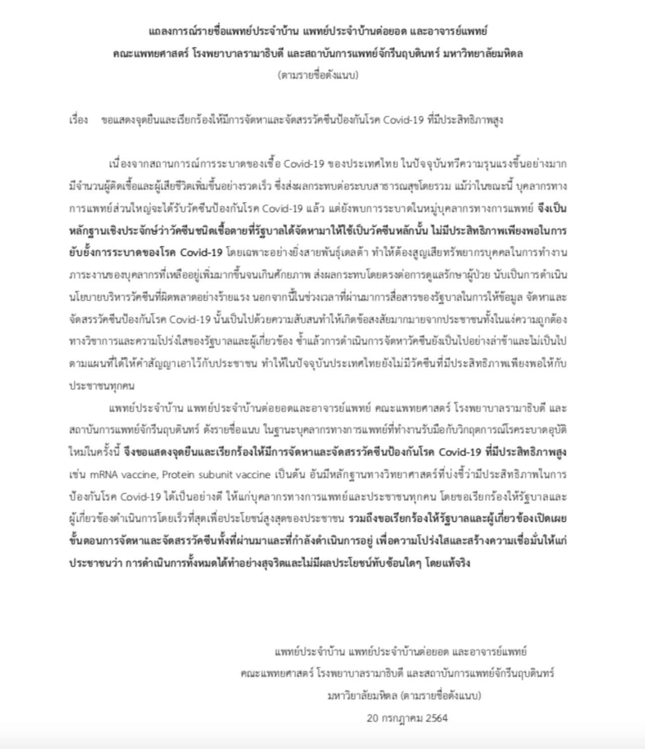 แพทย์ประจําบ้าน แพทย์ประจําบ้านต่อยอดและอาจารย์แพทย์ คณะแพทยศาสตร์ โรงพยาบาลรามาธิบดี และ สถาบันการแพทย์จักรีนฤบดินทร์ ดังรายชื่อแนบ ในฐานะบุคลากรทางการแพทย์ที่ทํางานรับมือกับวิกฤตการณ์โรคระบาดอุบัติใหม่ในครั้งนี้ จึงขอแสดงจุดยืนและเรียกร้องให้มีการจัดหาและจัดสรรวัคซีนป้องกันโรค Covid-19 ที่มีประสิทธิภาพสูง เช่น mRNA Vaccine, Protein Subunit Vaccine เป็นต้น อันมีหลักฐานทางวิทยาศาสตร์ที่บ่งชี้ว่ามีประสิทธิภาพในการป้องกันโรค Covid-19 ได้เป็นอย่างดี ให้แก่บุคลากรทางการแพทย์และประชาชนทุกคน