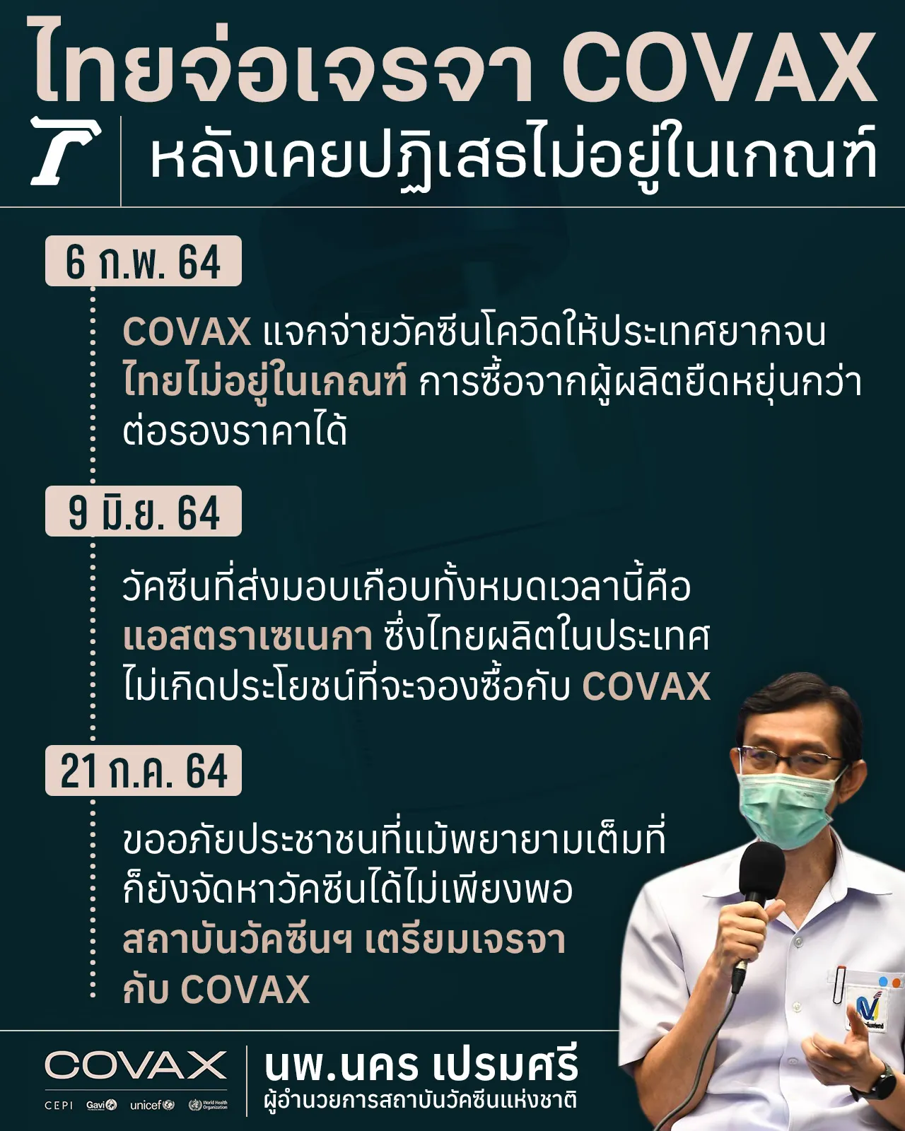 ผู้อำนวยการสถาบันวัคซีนแห่งชาติ ระบุเพิ่มเติมว่า เรายังอยู่ในการเข้าร่วมกับโครงการโคแวกซ์ (COVAX) เพียงแต่ยังไม่ได้ลงนามในการทำความร่วมมือการจัดหาวันซีนร่วมกันผ่านโครงการโคแวกซ์ ซึ่งสถาบันวัคซีนแห่งชาติได้เตรียมการเริ่มเจรจาโดยประสานงานไปที่องค์กรพันธมิตรเพื่อวัคซีนกาวี (Gavi) ในการขอเจรจาจัดหาวัคซีนร่วมกับโคแวกซ์ โดยมีเป้าหมายของการได้รับวัคซีนในปี 2565 เพิ่มเติมจากการเจรจากับบริษัทผู้ผลิตวัคซีนโดยลำพัง หากมีข้อสรุปชัดเจนจะเสนอผ่านคณะทำงานและคณะกรรมการที่เกี่ยวข้องต่อไป ยืนยันว่าสถาบันวัคซีนจะดำเนินการเต็มที่ต่อไป.
