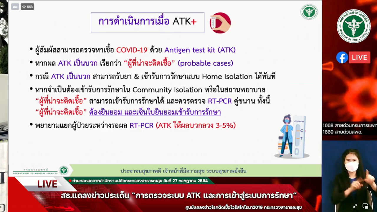 วันที่ 27 ก.ค. 2564 เวลา 13.30 น. ที่สำนักงานปลัดกระทรวงสาธารณสุข นพ.สมศักดิ์ อรรฆศิลป์ อธิบดีกรมการแพทย์ เปิดเผยถึงกรณีการตรวจหาเชื้อโควิด-19 ด้วย Antigen Test Kit หรือ ATK แล้วต้องดำเนินการต่อไปอย่างไร ว่า เมื่อประชาชนตรวจ ATK แล้วได้ผลเป็นบวก หรือ เป็นผู้ที่น่าจะติดเชื้อโควิด-19 (Probable Cases) เนื่องจากประสิทธิภาพของ ATK ยังอยู่ที่ 95% และมีความผิดพลาด 3-5% ซึ่งหมายความว่าอาจมีผู้ได้ผลบวก แต่ไม่ได้ติดเชื้อจริง ซึ่งทางกรมมีความกังวล เนื่องจากหากนำกลุ่มคนดังกล่าวไปรักษากับกลุ่มผู้ติดเชื้อ อาจติดเชื้อจริงได้
