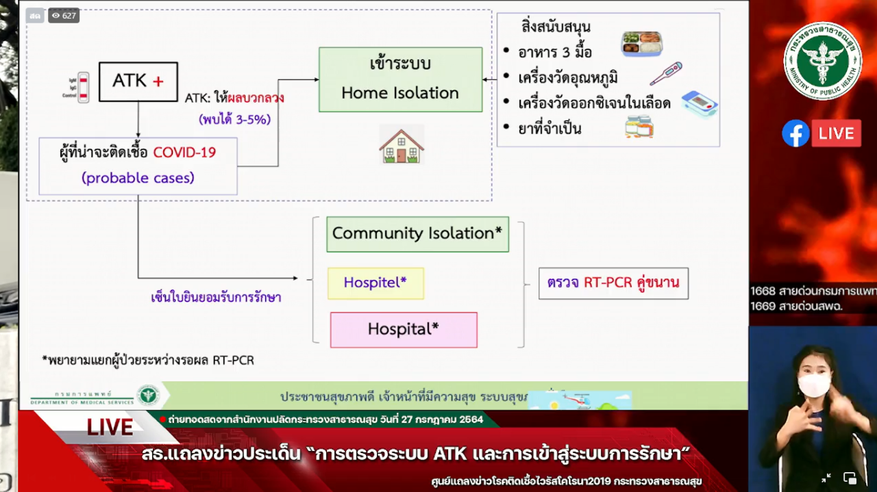 อธิบดีกรมการแพทย์ ย้ำ ผู้ตรวจ ATK ได้ผลบวก ต้องกักตัวแบบ Home Isolation ทันที ส่วนคนที่ทำไม่ได้จะถูกส่งไปยัง Community Isolation เพื่อตรวจ RT-PCR ซ้ำ ป้องกันผลปลอม