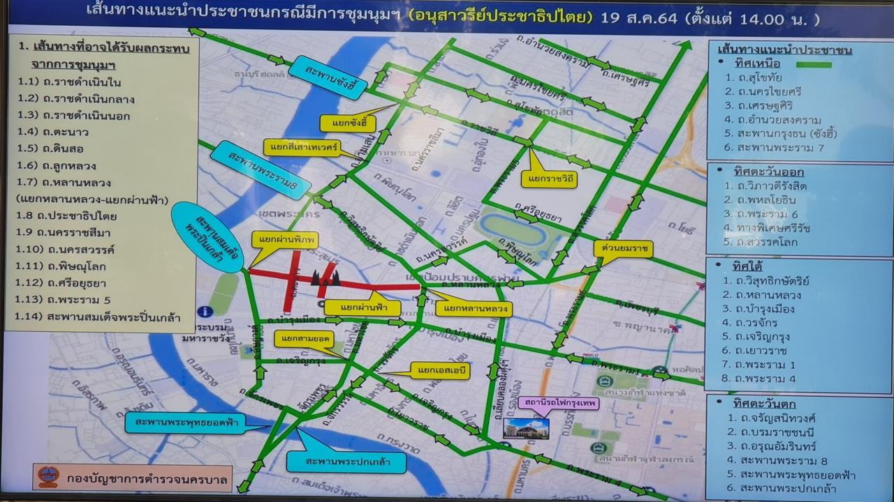 เมื่อวันที่ 19 ส.ค.2564 พล.ต.ต.จิรสันต์ แก้วแสงเอก รอง ผบช.น.ดูแลงานด้านจราจร กล่าวว่า เนื่องจากในวันนี้มีการนัดหมายชุมนุมที่บริเวณอนุสาวรีย์ประชาธิปไตย จึงแนะนำให้ประชาชนหลีกเลี่ยงเส้นทาง ตั้งแต่ 14.00 น. เป็นถนนราชดำเนินตลอดทั้งสาย ถนนหลานหลวง ถนนดินสอ ถนนตะนาว ถนนนครราชสีมา ถนนประชาธิปไตย สะพานสมเด็จพระปิ่นเกล้า