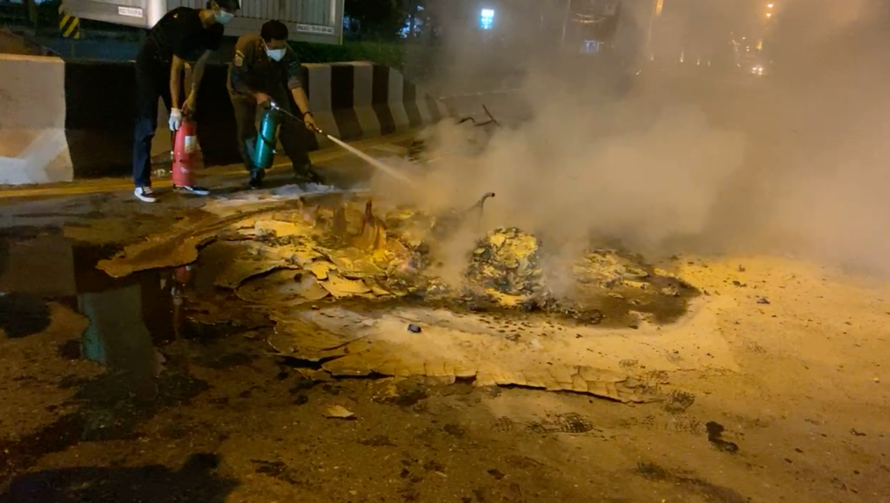 เวลา 21.17 น. มีประชาชนพยายามนำถังดับเพลิงเข้ามาช่วยดับไฟบริเวณดังกล่าว โดยมีมูลนิธิร่วมกตัญญูได้เข้ามาสมทบช่วยดับไฟ ทำให้กองไฟได้สงบลงแล้ว.
