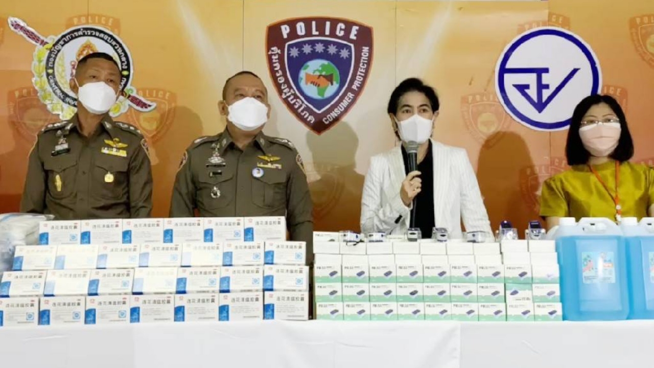 ที่กองบังคับการปราบปรามการกระทำผิดเกี่ยวกับการคุ้มครองผู้บริโภค (บก.ปคบ.) พล.ต.ต.ณัฐศักดิ์ เชาวนาศัย ผบก.ปคบ. พร้อมด้วย พ.ต.อ.เนติ วงษ์กุหลาบ ผกก.4 บก.ปคบ. และ ภญ.สุภัทรา บุญเสริม ผู้ทรงคุณวุฒิด้านมาตรฐานผลิตภัณฑ์ด้านสาธารณสุข และรักษาราชการแทนรองเลขาธิการคณะกรรมการอาหารและยา (อย.) ร่วมแถลงผลการจับกุมผลิตภัณฑ์ป้องกันโควิด-19 ผิดกฎหมาย เช่น ผลิตภัณฑ์ยาสมุนไพรเหลียนฮัว ชิงเวิน แคปซูล, เครื่องมือแพทย์ประเภทชุด PPE, เครื่องวัดออกซิเจนที่ปลายนิ้ว และเจลแอลกอฮอล์ ซึ่งอาจเป็นอันตรายต่อผู้บริโภคหลายรายการ