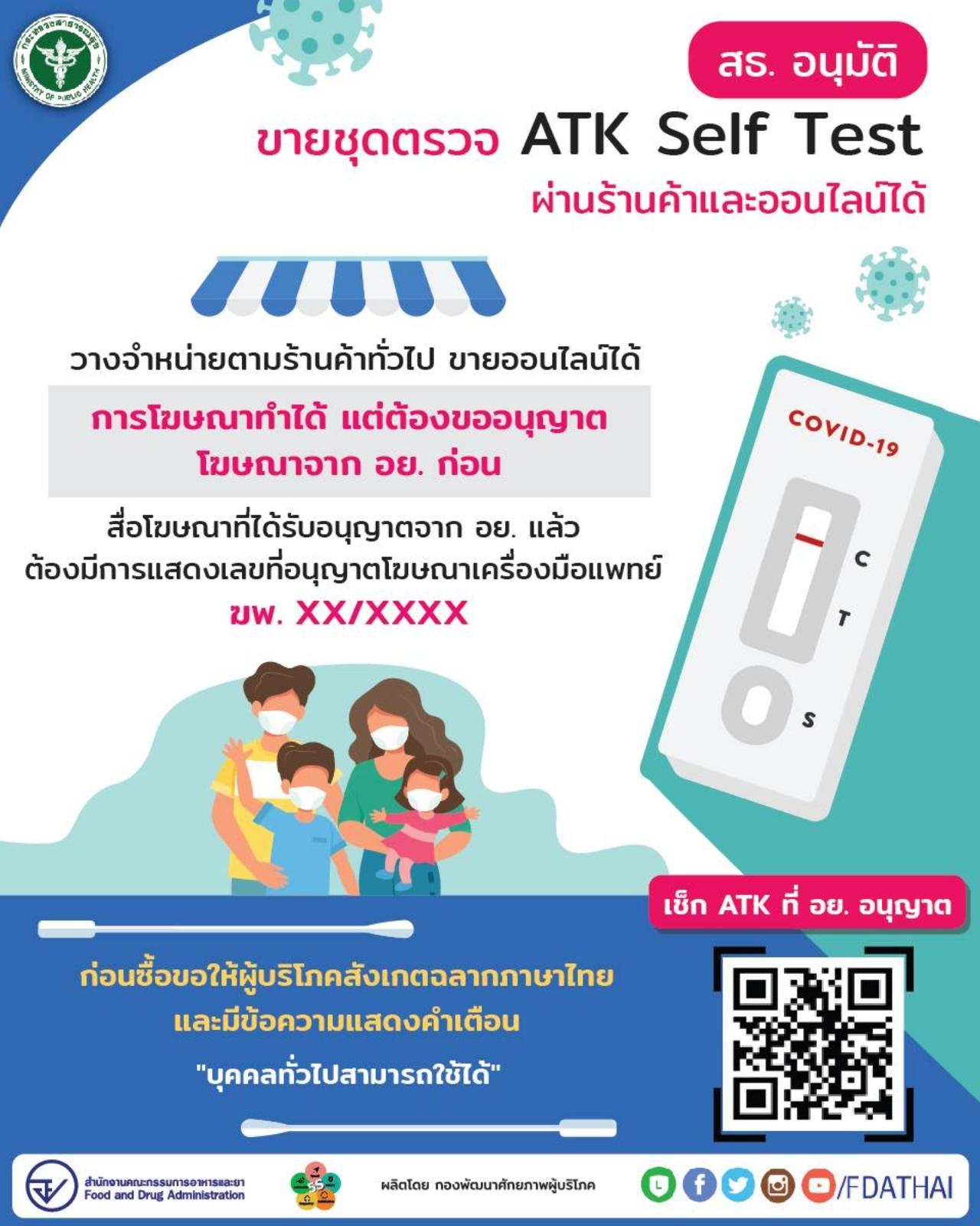 ทั้งนี้ ประชาชนทั่วไป ห้างร้าน บริษัท สามารถรับสินค้าจากบริษัทผู้ผลิตหรือผู้นำเข้าที่ได้รับอนุญาตนำเข้าถูกต้องจาก อย. ได้โดยตรง สำหรับผู้บริโภคสามารถตรวจสอบชุดตรวจ ATK ที่ได้รับอนุญาตจาก อย. ได้ทางเว็บไซต์ อย. หรือทางคิวอาร์โค้ด และก่อนซื้อขอให้ผู้บริโภคสังเกตฉลากภาษาไทย และมีข้อความแสดงคำเตือน “บุคคลทั่วไปสามารถใช้ได้” เพื่อให้ได้รับชุดตรวจ ATK Self Test ที่มีคุณภาพมาตรฐาน อย่างไรก็ตาม ผู้ประกอบการที่ทำสื่อโฆษณาเพื่อจำหน่ายชุดตรวจ ไม่ว่ารูปแบบใดก็ตาม ต้องได้รับอนุญาตจาก อย. ก่อน โดยต้องมีการแสดงเลขที่อนุญาตโฆษณาเครื่องมือแพทย์ ฆพ. XX/XXXX