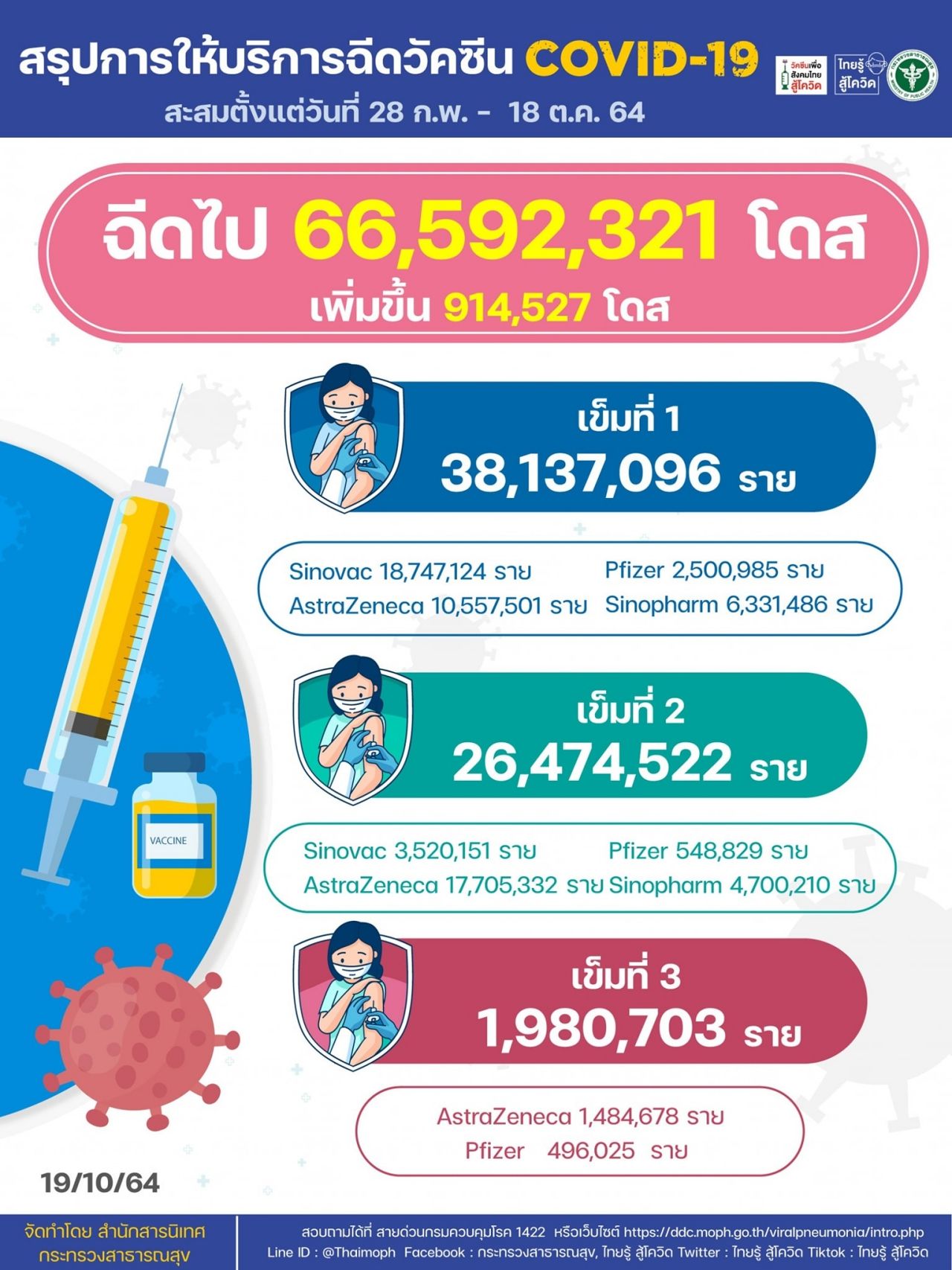 จำนวนผู้รับวัคซีนสะสม ตั้งแต่วันที่ 28 ก.พ.-18 ต.ค. 2564 (233 วัน) 66,592,321 โดส ในพื้นที่ 77 จังหวัด