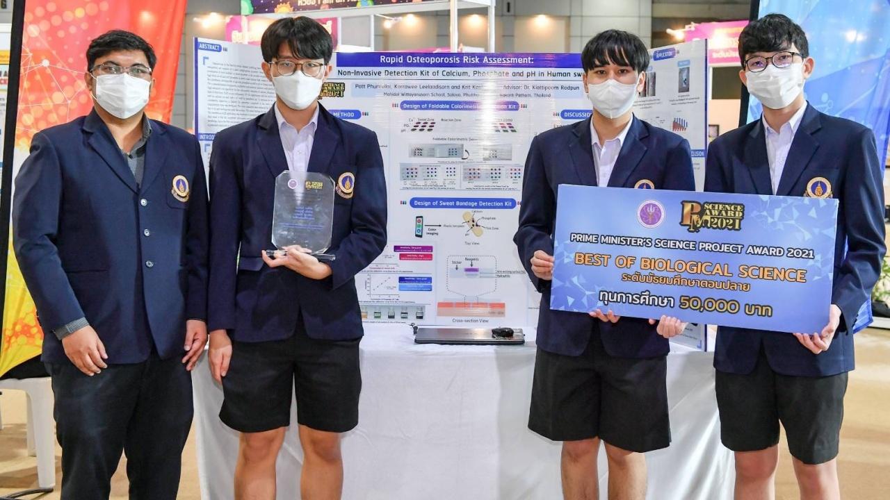 “โครงงานนวตกรรมชุดทดสอบเหงื่อเพื่อประเมินความเสี่ยงของโรงกระดูกพรุน จากการค้นคว้าพบว่า คนไทยมากกว่า 1 ล้านคนเป็นโรคกระดูกพรุน การประเมินความเสี่ยงเบื้องต้นยังไม่ค่อยมีความถูกต้องมากเท่าที่ควร เราเลยอยากจะสร้างเครื่องมือมาวัดเบื้องต้นให้ถูกต้องมายิ่งขึ้น รู้สึกประทับใจที่เราได้รับรางวัลใหญ่ของประเทศ แต่ละขั้นที่มีการแข่งขันก็จะมีนักวิจัยให้คำแนะนำเพิ่มเติมว่าโครงงานเราจะมีทิศทางยังไงควรพิจารณาต่อยังไง ขอบคุณนักวิจัยและผู้มีส่วนเกี่ยวข้องที่ทำให้เกิดรางวัลดีๆ นี้ขึ้นมาทำให้พวกเราสามารถพัฒนาโครงงานมาจนถึงจุดนี้ได้ครับ ในอนาคตอยากจะพัฒนาโครงงานตัวนี้ต่อไปเพื่อวงการแพทย์”