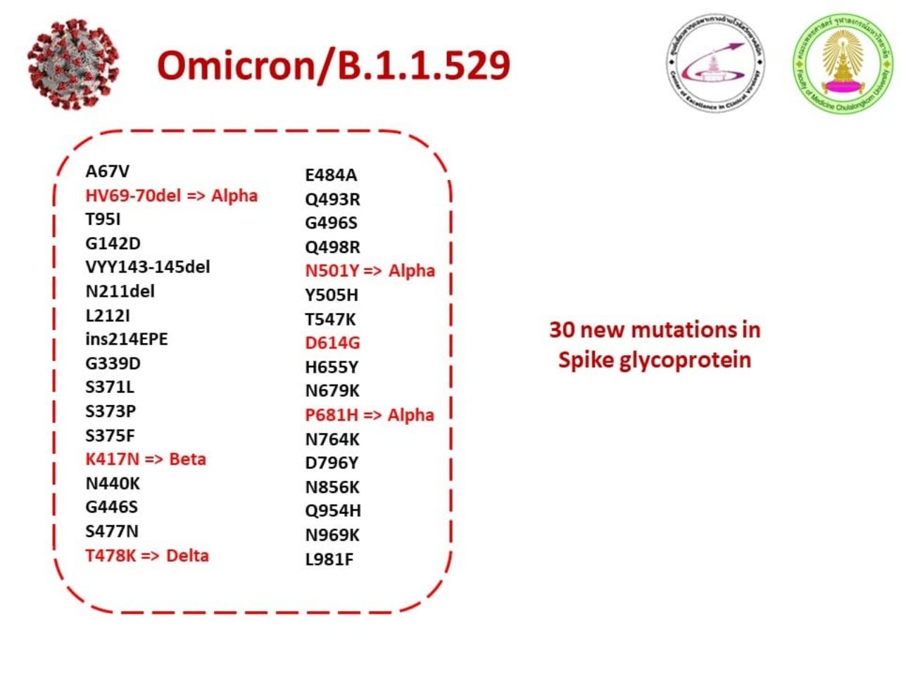 วันที่ 29 พ.ย. 2564 ศ.นพ.ยง ภู่วรวรรณ หัวหน้าศูนย์เชี่ยวชาญเฉพาะทางด้านไวรัสวิทยาคลินิก โพสต์ข้อความถึงกรณีโควิด-19 สายพันธุ์ใหม่โอไมครอน (Omicron) ผ่านแฟนเพจเฟซบุ๊ก ว่า ขณะนี้ทั่วโลกให้ความสนใจมากกับไวรัสสายพันธุ์ใหม่โอไมครอน เพราะการกลายพันธุ์เฉพาะในส่วนหนามแหลม สามารถเก็บจากการกลายพันธุ์ที่เกิดในสายพันธุ์อัลฟา เบตา และเดลตา มาแล้ว ยังเพิ่มตำแหน่งการกลายพันธุ์เพิ่มขึ้นอีก 30 ตำแหน่ง สำหรับสิ่งที่จะต้องตอบคำถามขณะนี้ คือ