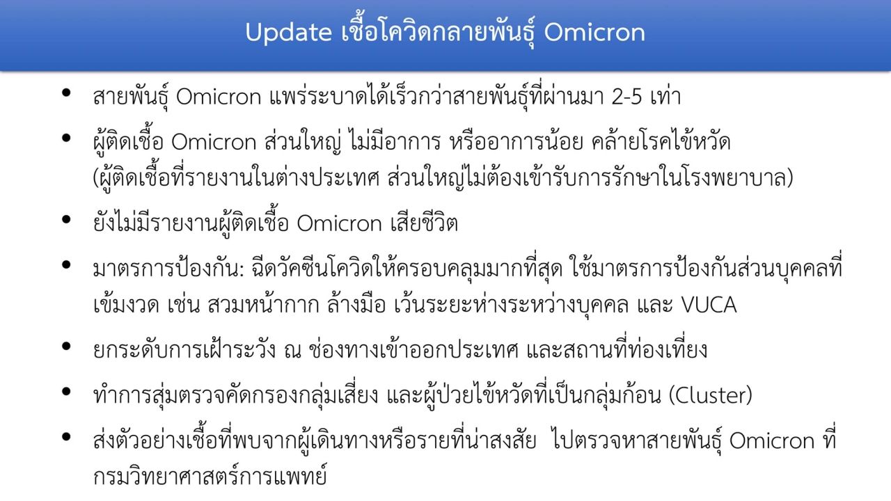“ขอเน้นย้ำให้พี่น้องประชาชนได้มั่นใจว่า กระทรวงสาธารณสุขและหน่วยงานที่เกี่ยวข้องในประเทศ ไม่ว่าจะเป็นฝ่ายความมั่นคง การเดินทางเข้าประเทศ เรามีมาตรการที่สามารถรองรับกับสายพันธุ์โอมิครอนได้ ประการต่อไปคือ สายพันธุ์โอมิครอนในข้อมูลขณะนี้ทั่วโลกเห็นตรงกันว่าความรุนแรงของโรคค่อนข้างน้อย แต่อย่างไรก็ตามในสถานการณ์ที่ข้อมูลข่าวสารของเรื่องไวรัสโคโรนา 2019 มีการเปลี่ยนแปลงตลอดเวลา การรับฟังข้อมูลต่างๆ ก็คงจะต้องมีการวิเคราะห์ไตร่ตรองเพื่อไม่ให้เกิดผลกระทบที่ตามมามากมาย”