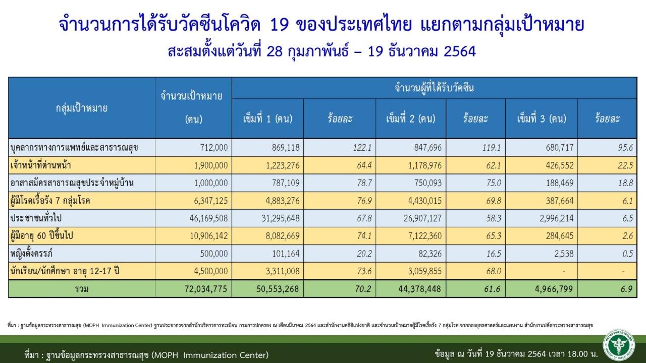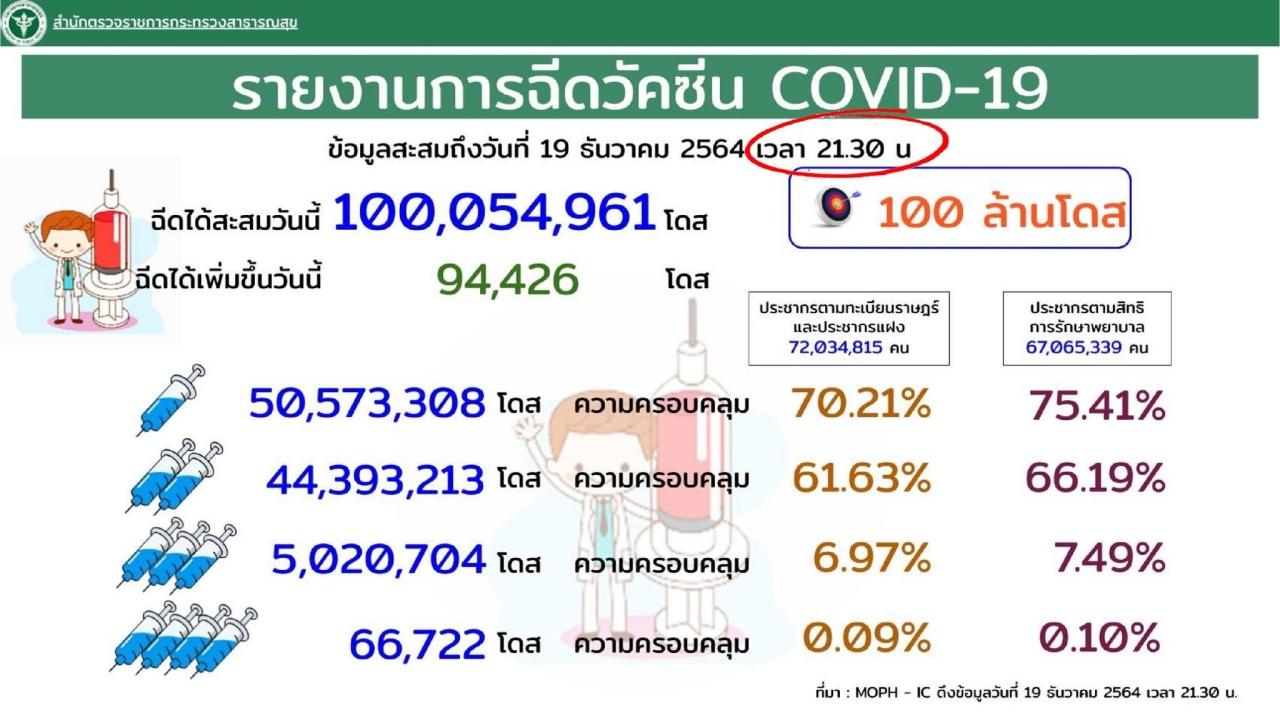 ทางด้าน นายแพทย์เกียรติภูมิ วงศ์รจิต ปลัดกระทรวงสาธารณสุข เปิดเผยวันนี้ว่า ตามที่กระทรวงสาธารณสุข กำหนดเป้าหมายการฉีดวัคซีนโควิด-19 ให้ได้ 100 ล้านโดสนั้น ข้อมูลจากหน่วยงานสาธารณสุขในพื้นที่ที่รายงานผ่านสำนักตรวจราชการกระทรวงสาธารณสุข วันที่ 19 ธ.ค. 2564 เวลา 21.30 น. บรรลุเป้าหมายแล้ว มียอดการฉีดวัคซีนสะสมอยู่ที่ 100,054,961 โดส ครอบคลุมประชากรตามทะเบียนราษฎร์และประชากรแฝงซึ่งมี 72 ล้านคนดังนี้ เข็มที่ 1 จำนวน 50,573,308 คน คิดเป็น 70.21% เข็มที่ 2 จำนวน 44,393,213 คน คิดเป็น 61.63% เข็มที่ 3 จำนวน 5,020,704 คน คิดเป็น 6.97% และเข็มที่ 4 จำนวน 66,722 คน คิดเป็น 0.09%