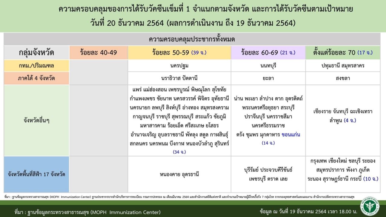 - ผู้ได้รับวัคซีนเข็มที่ 1 จำนวน 50,553,268 ราย (คิดเป็น 70.2% ของประชากร)