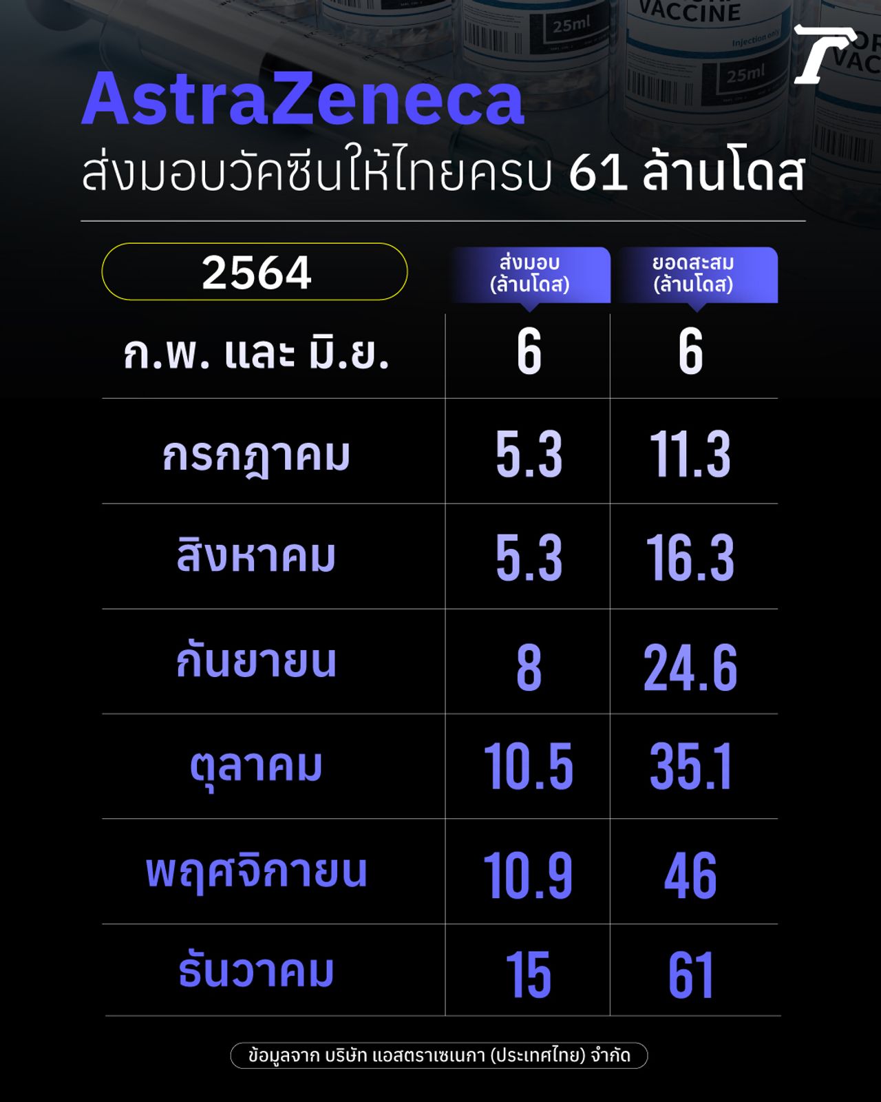 สำหรับจำนวนวัคซีนแอสตราเซเนกาที่ส่งมอบให้ไทยรวม 61 ล้านโดส มีดังนี้