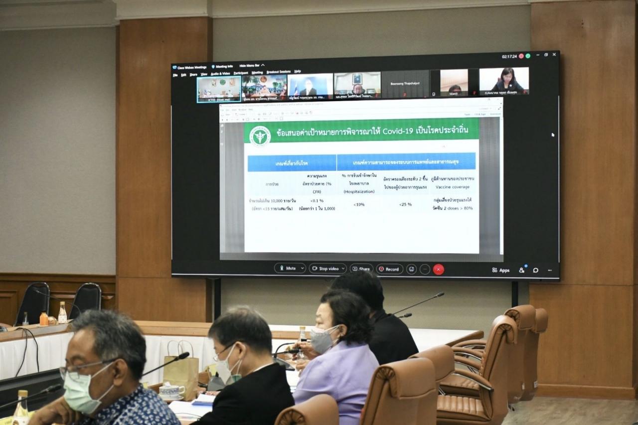 1. เห็นชอบแนวทางการพิจารณาให้โรคโควิด-19 เป็นโรคประจำถิ่น (endemic disease) มีหลักเกณฑ์และค่าเป้าหมาย เช่น ผู้ป่วยรายใหม่ไม่เกิน 10,000 ราย/วัน อัตราป่วย-ตาย น้อยกว่าร้อยละ 0.1 การเข้ารับการรักษาในโรงพยาบาล น้อยกว่าร้อยละ 10 และประชาชนมีภูมิต้านทานเพียงพอ กลุ่มเสี่ยงป่วยรุนแรงได้วัคซีนอย่างน้อย 2 โดส มากกว่า 80% เป็นต้น ซึ่งหากสถานการณ์เหมาะสมและเข้าหลักเกณฑ์ที่กำหนด กระทรวงสาธารณสุขจะมีการประกาศแจ้งให้ทราบอีกครั้ง