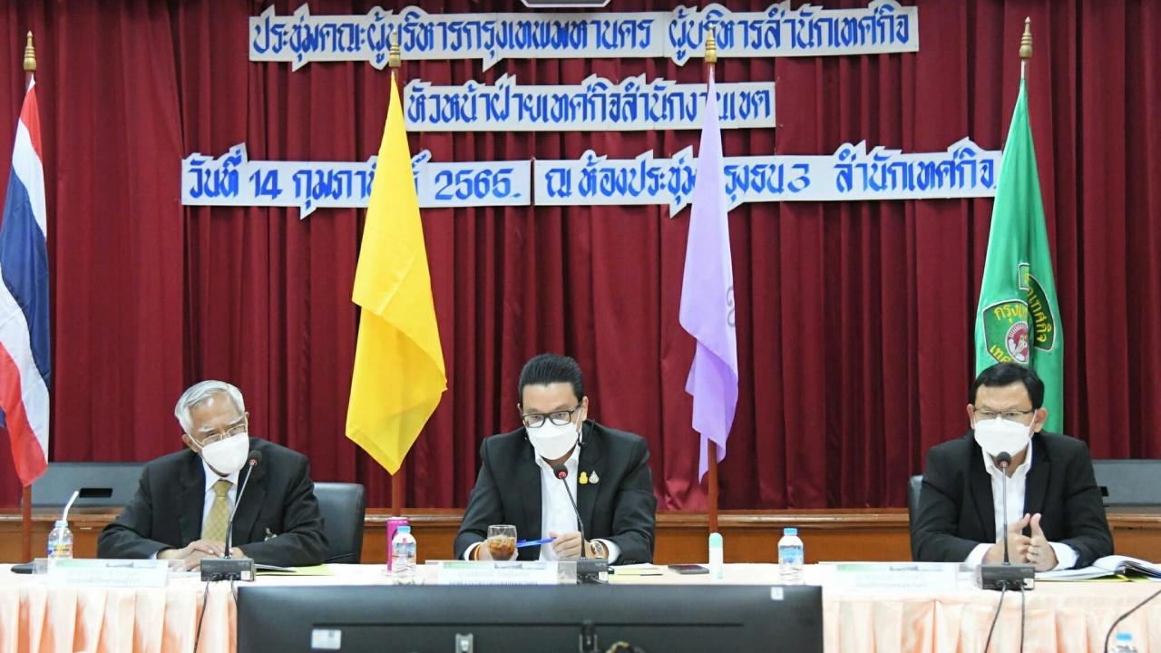 วันที่ 14 ก.พ. 2565 นายสกลธี ภัททิยกุล รองผู้ว่าราชการกรุงเทพมหานคร เป็นประธานการประชุมคณะผู้บริหารกรุงเทพมหานคร ผู้บริหารสำนักเทศกิจ และหัวหน้าฝ่ายเทศกิจ สำนักงานเขต ครั้งที่ 4/2565 เพื่อมอบนโยบายและแนวทางการปฏิบัติงานแก่เจ้าหน้าที่เทศกิจ โดยในที่ประชุม ได้จัดเจ้าหน้าที่เทศกิจบูรณาการความร่วมมือกับเจ้าหน้าที่ตำรวจ ทหาร และ 50 สำนักงานเขต ตรวจความเรียบร้อยสถานประกอบการที่ได้รับการผ่อนปรนให้เปิดดำเนินการได้ภายใต้มาตรการป้องกันการแพร่ระบาดของโรคโควิด-19