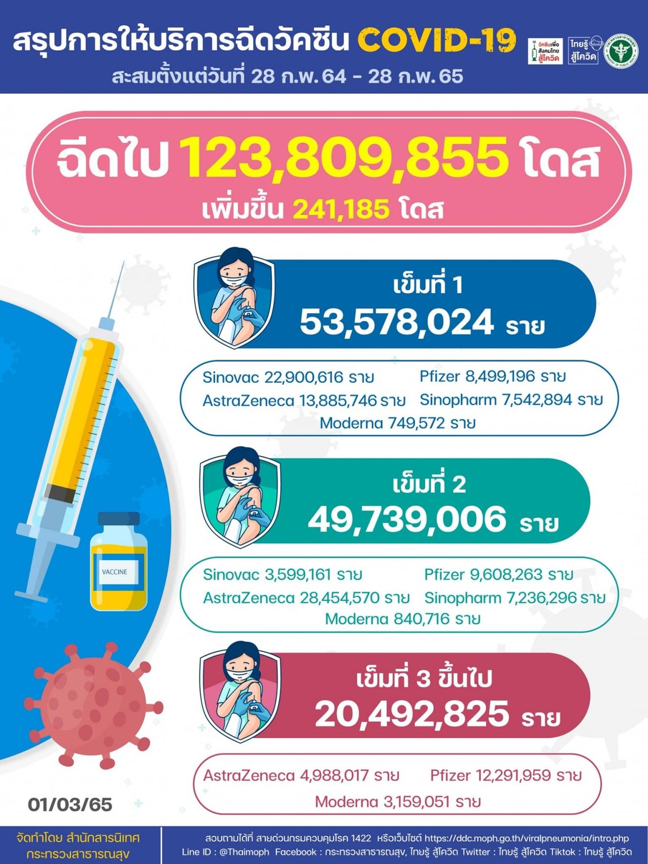 อัปเดตฉีดวัคซีนโควิด-19 ตั้งแต่ 28 ก.พ. 64 - 28 ก.พ. 65 ยอดสะสมล่าสุดแตะ 123.8 ล้านโดส วานนี้ฉีดเพิ่ม 2.4 แสนโดส ขณะที่ยอดคนฉีดเข็ม 3 ล่าสุด ขยับขึ้นเป็น 29.5% ของประชากร