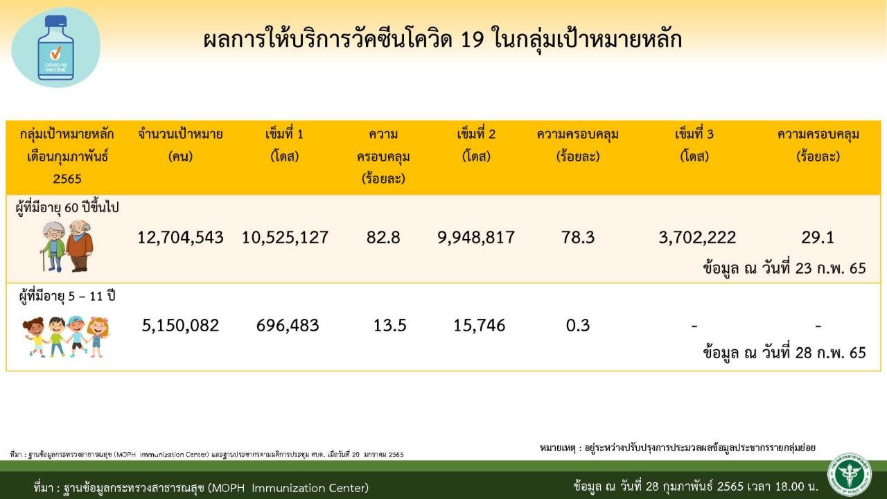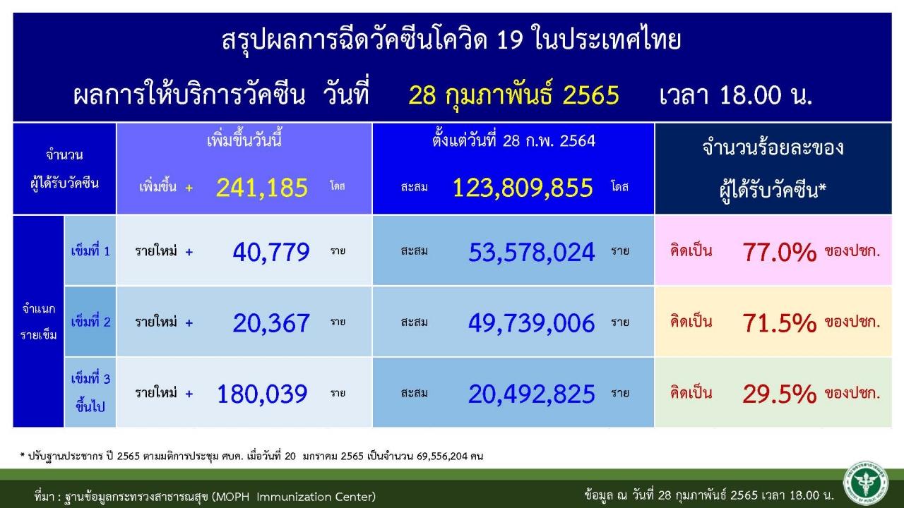 สำหรับการรายงานข้อมูลการฉีดวัคซีนในภาพรวม ณ วันที่ 28 ก.พ. 2565 เวลา 18.00 น. เพิ่มขึ้น 241,185 โดส