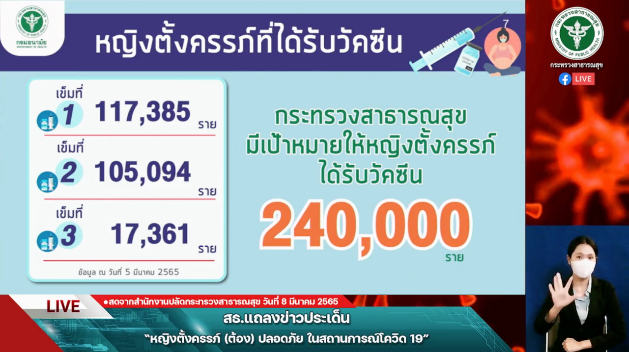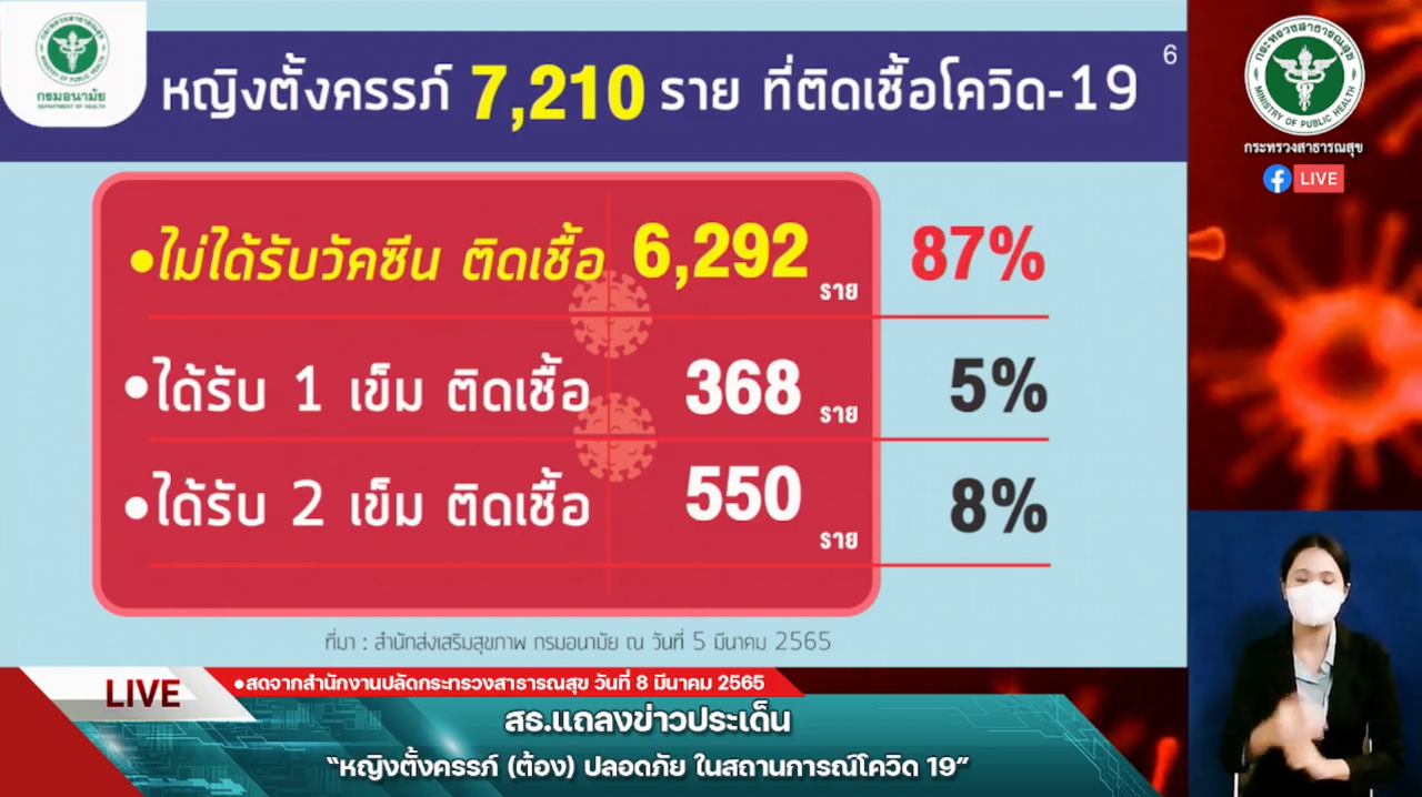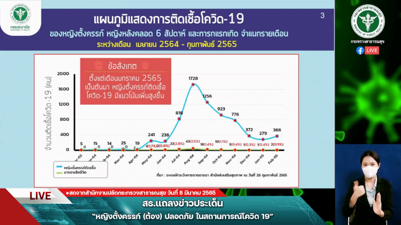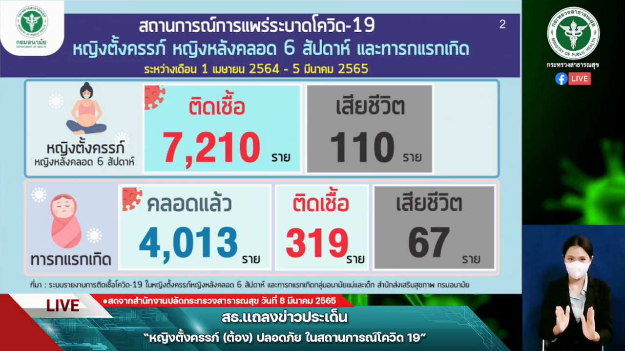 เมื่อเวลา 13.30 น. วันที่ 8 มี.ค. 2565 นายแพทย์สุวรรณชัย วัฒนายิ่งเจริญชัย อธิบดีกรมอนามัย แถลงข่าวที่กระทรวงสาธารณสุข ว่า หญิงตั้งครรภ์และหญิงหลังคลอด 6 สัปดาห์ ก็ถือเป็นกลุ่มที่ต้องเฝ้าระวังเป็นพิเศษ ซึ่งตั้งแต่ 27 ก.พ.-5 มี.ค. 2565 มีการติดเชื้อโควิด-19 ในหญิงกลุ่มนี้ถึง 224 ราย