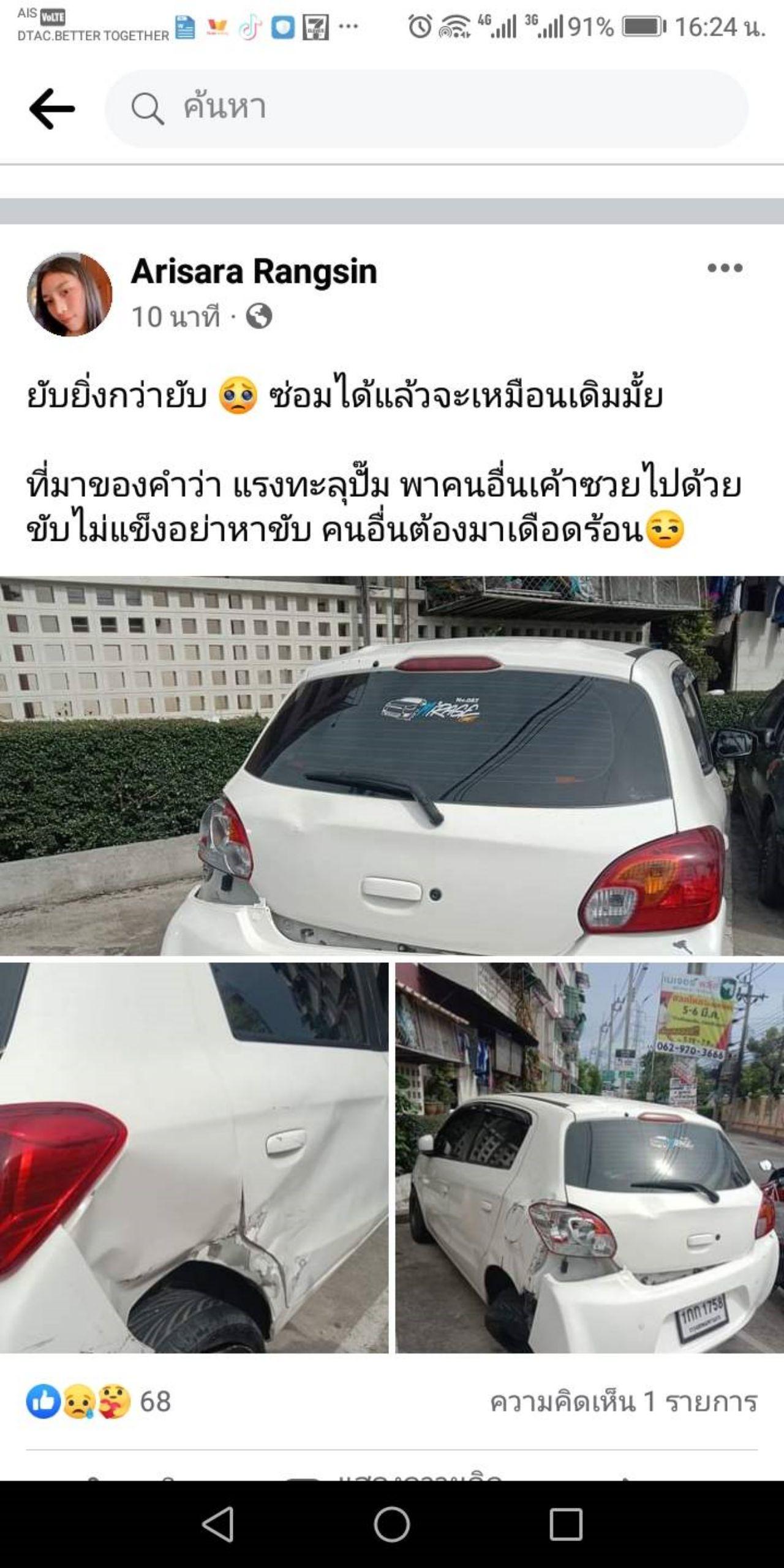 ต่อมา น.ส.อริสรา รังศิลป์ อายุ 23 ปี เจ้าของรถยนต์มิตซูบิชิ รุ่นมิราจ คู่กรณีที่ได้รับความเสียหาย และเป็นผู้โพสต์เฟซบุ๊กเตือนภัย ได้เล่าให้ผู้สื่อข่าวฟังผ่านทางโทรศัพท์ว่า หลังเกิดเหตุตนซึ่งนั่งอยู่ในรถได้รับบาดเจ็บหัวโน และเจ็บหน้าอก หน่วยกู้ภัยจึงนำตัวส่งรักษาที่ รพ.สหวิทยาการมะลิ นอนพักอยู่ 1 คืน แพทย์เอกซเรย์แล้วไม่พบความน่าวิตกใดๆ เพิ่งจะออกจากโรงพยาบาลมาเมื่อช่วงบ่าย อย่างไรก็ตามตอนนี้รถไม่ได้ใช้ทำให้ได้รับความเดือดร้อน เพราะตนเป็นแม่ค้าขายขนมลูกชุบต้องตระเวนขายไปตามตลาดนัด ทำให้ต้องขาดรายได้ ในระหว่างที่นอนรักษาอาการ