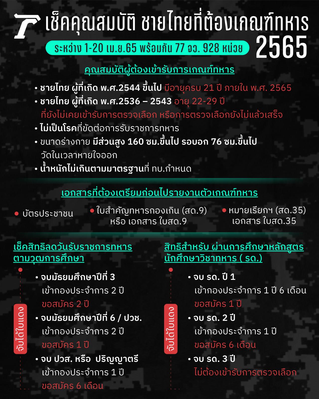 ทั้งนี้กองทัพบกจะทำการตรวจเลือกทหารกองเกินเข้ารับราชการเป็นทหารกองประจำการในปี 2565 ระหว่างวันที่ 1-20 เมษายน 2565 (เว้นวันที่ 6 และ 13-15 เม.ย.) โดยได้เตรียมความพร้อมทั้งบุคลากร สถานที่ การบริหารจัดการที่กระชับรวดเร็ว อำนวยความสะดวกให้ผู้เข้ารับการตรวจเลือกอย่างเต็มที่ ภายใต้มาตรการป้องกันโควิด-19 รวมทั้งคณะกรรมการตรวจเลือกที่จะดำเนินการพร้อมกันใน 77 จังหวัด 928 หน่วยตรวจเลือก.