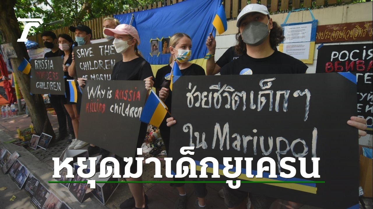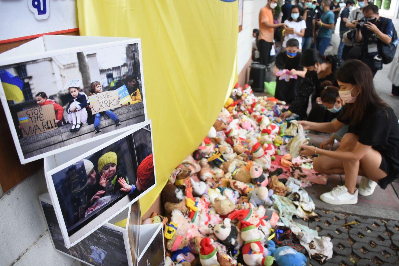 ชาวยูเครนที่อาศัยอยู่ในไทย ร่วมกันนำตุ๊กตาหลากหลายขนาดที่มีรอยบาดแผล เป็นตัวแทนเด็กๆ ชาวยูเครนที่เสียชีวิตในสงคราม พร้อมวางดอกไม้และเทียนเพื่อไว้อาลัยแก่เด็กที่เสียชีวิตในสงคราม