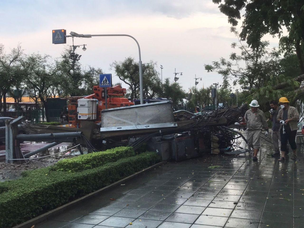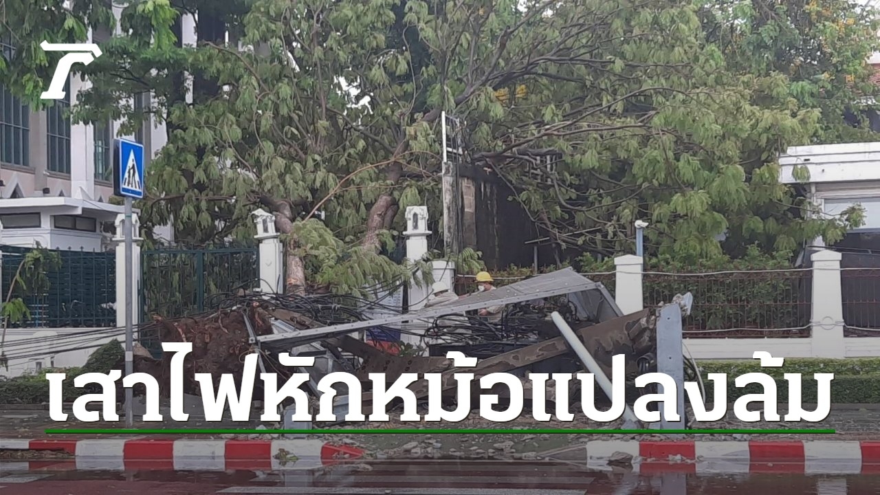 พายุฝนถล่มกรุงเทพฯ ลมกระโชกแรงต้นไม้ใหญ่ล้มเหนี่ยวรั้งสายไฟหม้อแปลงทับรถจยย.พัง หน้า ม.ธรรมศาสตร์ ท่าพระจันทร์ ก่อนดึงเสาไฟฟ้าล้มอีก 2 ต้น ทำให้ใน มธ.และที่ใกล้เคียงไฟดับ ทาง กฟน.เข้าแก้ไขแล้ว