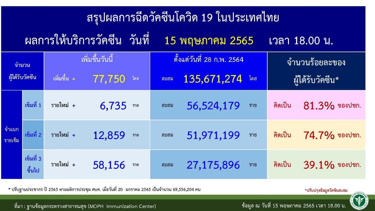 จำนวนผู้รับวัคซีนสะสม ตั้งแต่วันที่ 28 ก.พ. - 15 พ.ค. 2565 (442 วัน) 135,671,274 โดส ในพื้นที่ 77 จังหวัด