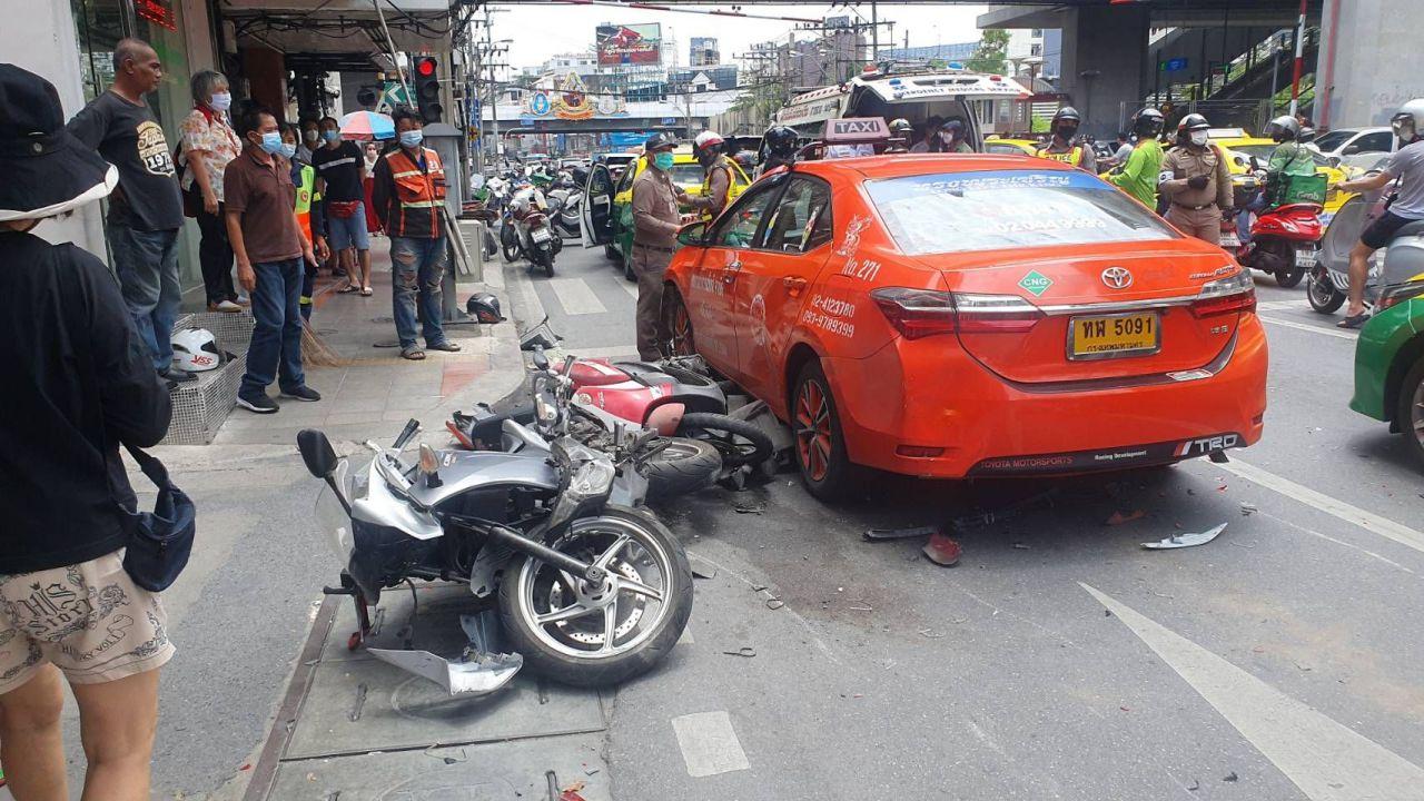 จากการสอบสวนทราบว่า ก่อนเกิดเหตุรถแท็กซี่สีเขียวเหลือง ทะเบียน 1มก6234 กรุงเทพมหานคร จอดติดไฟแดงอยู่บริเวณช่องทางด้านซ้าย โดยมีรถ จยย.จอดอยู่ใกล้เคียงจำนวนมาก ก่อนแท็กซี่สีส้ม ทะเบียน ทฬ 5091 กรุงเทพมหานคร มีนายคำไพ ต่อซอน อายุ 60 ปี เป็นคนขับ พุ่งเข้ามาทางด้านท้าย มีเสียงเหมือนพยายามเบรกดังมาก แต่หยุดรถไม่ได้ ก่อนพุ่งเข้าชนรถแท็กซี่ และรถ จยย.ที่จอดอยู่ข้างหน้า ทำให้คนขี่รถจยย.ได้รับบาดเจ็บ