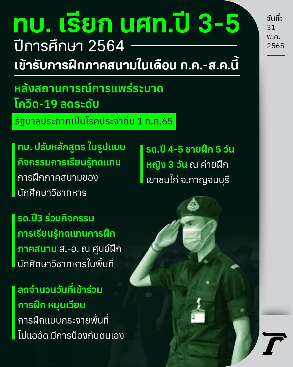 เมื่อวันที่ 31 พ.ค.65 พ.อ.หญิง ศิริจันทร์ งาทอง รองโฆษก ทบ. เผยว่า ตามที่ตั้งแต่เดือนธันวาคม 2564 กองทัพบกได้ประกาศเลื่อนฝึกภาคสนามของนักศึกษาวิชาทหารชั้นปีที่ 3-5 ปีการศึกษา 2564 ออกไป เนื่องจากสถานการณ์การแพร่ระบาดของโรคโควิด-19 ในช่วงนั้น และในปัจจุบันสถานการณ์ได้ลดระดับลงอย่างต่อเนื่อง และรัฐบาลได้ประกาศเตรียมปรับโควิด-19 เป็นโรคประจำถิ่น ใน 1 กรกฎาคม 2565 ตามแผนที่กระทรวงสาธารณสุขกำหนด ประกอบกับตั้งแต่เดือนพฤษภาคม เป็นต้นมา สถานศึกษาต่างๆได้เปิดการเรียนการสอน และภาคส่วนต่างๆ ได้เริ่มประกอบการเกือบแล้วเข้าสู่ภาวะปกติ