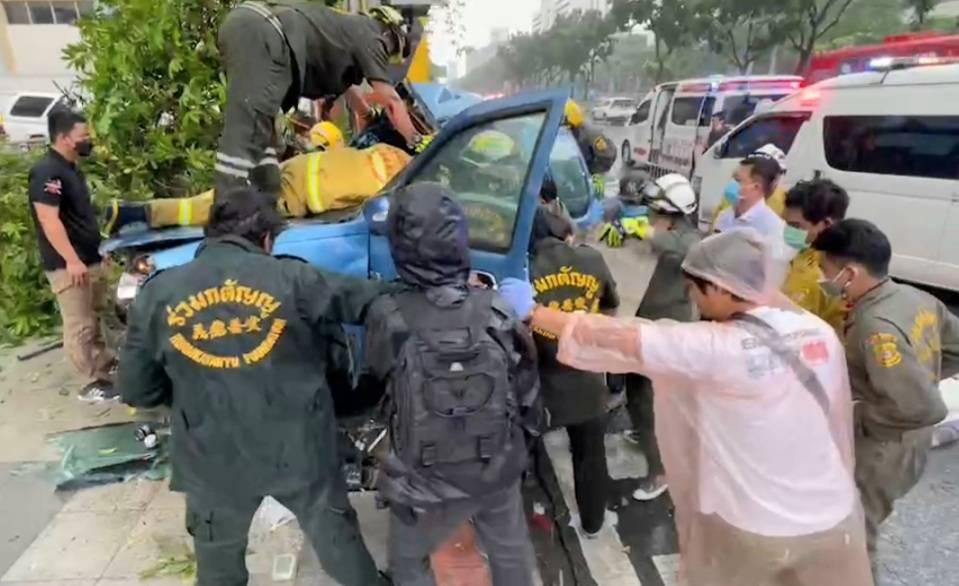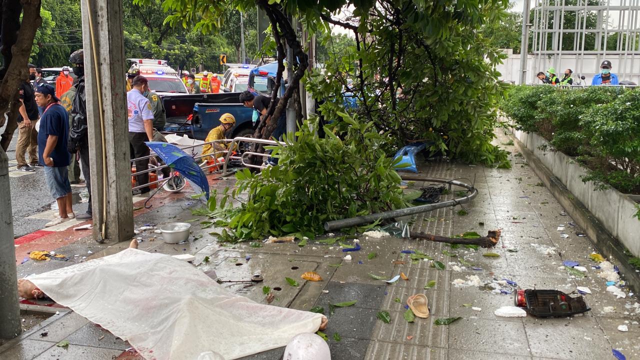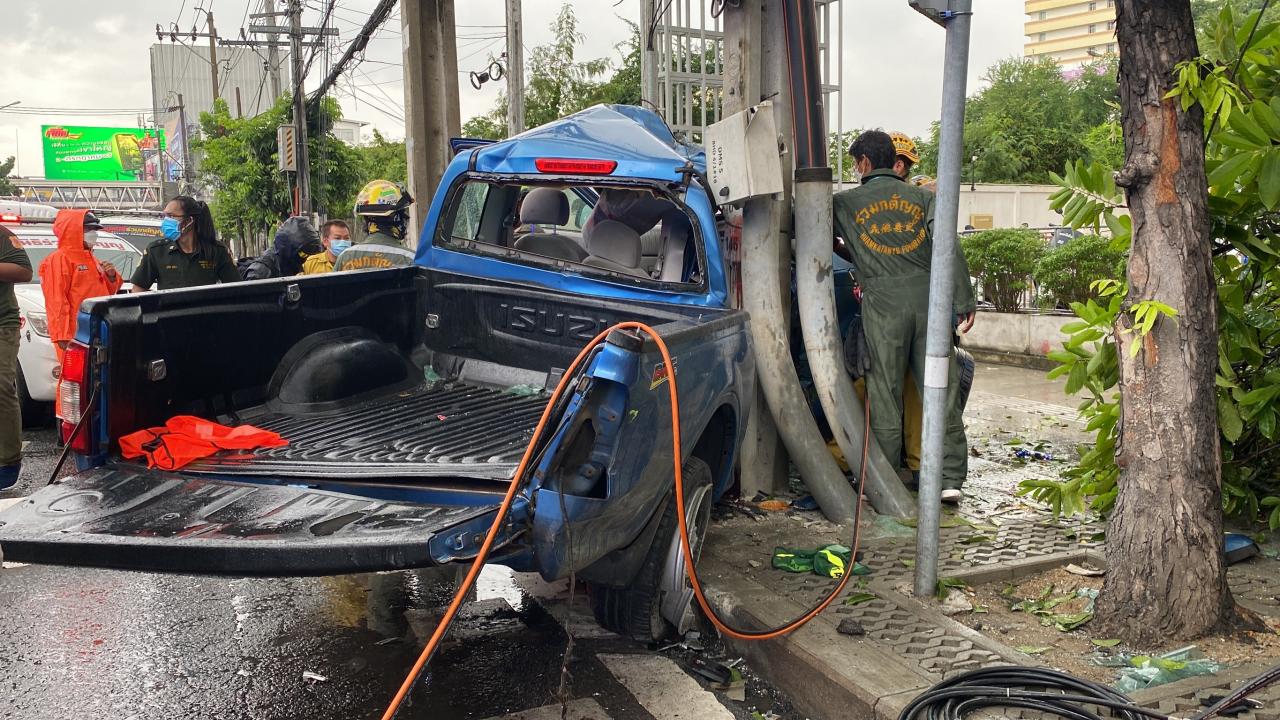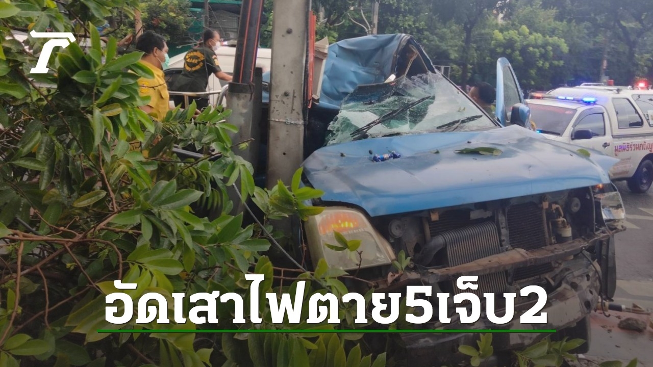รถกระบะซิ่งบรรทุกคนงานช่วงฝนตกถนนลื่น เสียหลักชนต้นไม้ เสาไฟฟ้า ตรงข้ามศาลยุติธรรม ดับ 5 เจ็บ 2 ตำรวจเตรียมเช็กกล้องวงจรปิดเพื่อหาสาเหตุอบุติเหตุครั้งนี้