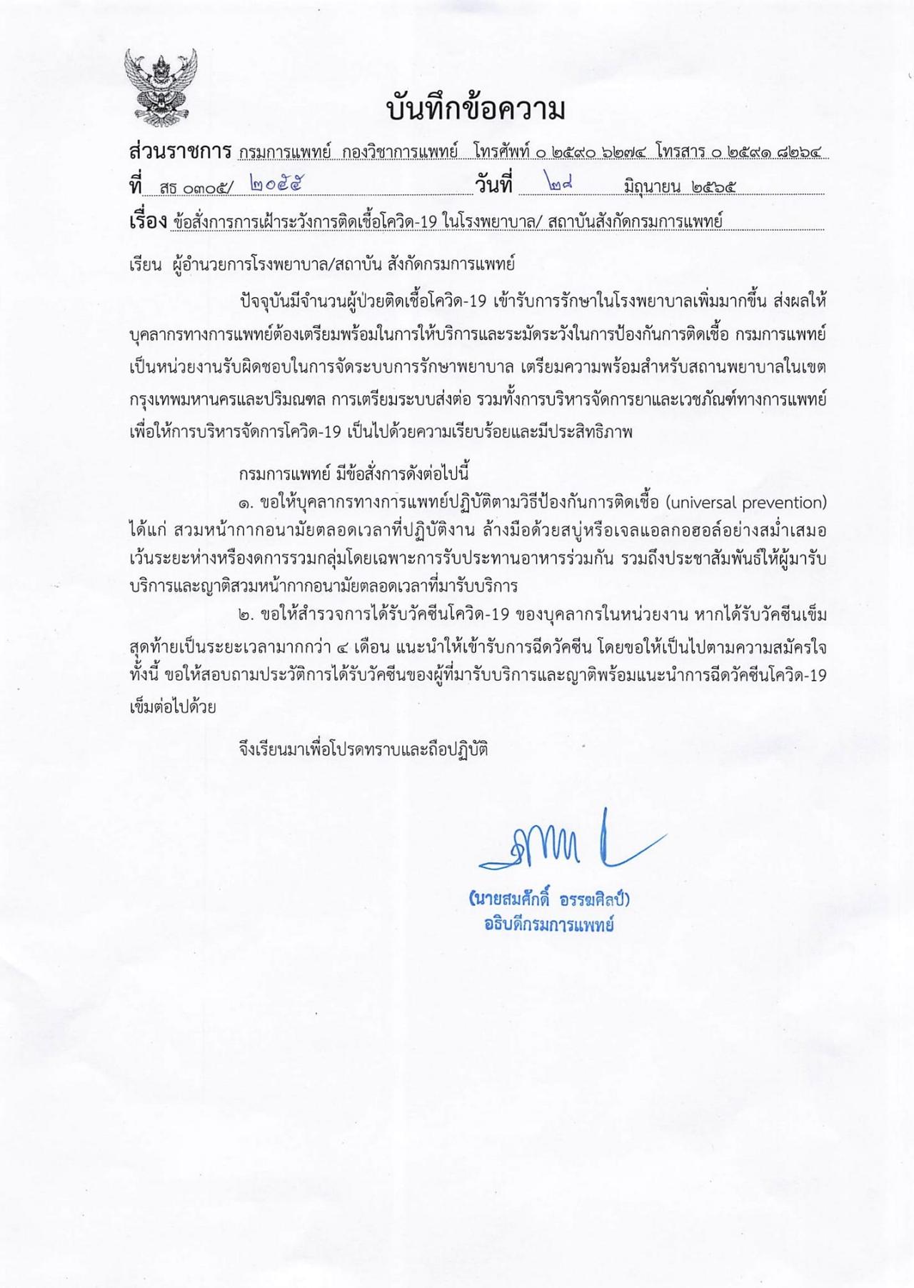 วันที่ 29 มิ.ย. 2565 ผู้สื่อข่าวรายงานว่า เฟซบุ๊กกรมการแพทย์ เผยแพร่บันทึกข้อความ ลงนามโดย นายแพทย์สมศักดิ์ อรรฆศิลป์ อธิบดีกรมการแพทย์ ถึงผู้อำนวยการโรงพยาบาล/สถาบัน สังกัดกรมการแพทย์ ระบุว่า ปัจจุบันมีจำนวนผู้ป่วยติดเชื้อโควิด-19 เข้ารับการรักษาในโรงพยาบาลเพิ่มมากขึ้น ส่งผลให้บุคลากรทางการแพทย์ต้องเตรียมพร้อมในการให้บริการและระมัดระวังในการป้องกันการติดเชื้อ