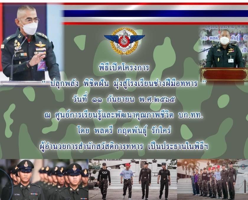 เมื่อวันที่ 11 ก.ย. 65 ที่ศูนย์การเรียนรู้และพัฒนาคุณภาพชีวิต กองบัญชาการกองทัพไทย (บก.ทท.) พล.ต.กฤตพันธุ์ รักใคร่ ผอ.สำนักสวัสดิการทหาร (สสก.ทหาร) ได้จัดกิจกรรมการอบรมเยาวชนลูกหลานกำลังพล บก.ทท. เพื่อเตรียมความพร้อมในการสอบเข้า ร.ร.ช่างฝีมือทหาร (ชท.ทหาร) และสถาบันการศึกษาทางทหารอื่นๆ