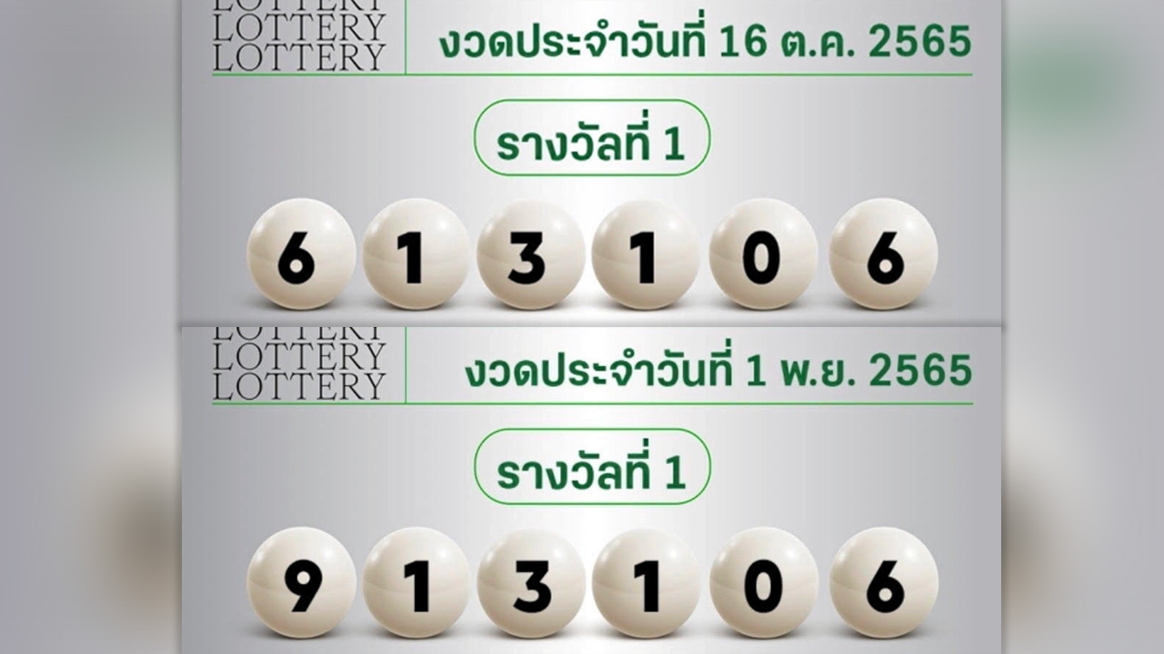 ภาพเปรียบผลการออกรางวัลสลากกินแบ่งรัฐบาลงวดวันที่ 16 ต.ค.2565 กับงวดวันที่ 1 พ.ย.2565 ที่ทำคอหวยถึงกับอึ้งไปตามๆกัน เมื่อเลขที่ออก ตำแหน่งตรงและเหมือนกันถึง 5 หลัก ต่างกันที่เลขตัวหน้าคือ 6 กับ 9.