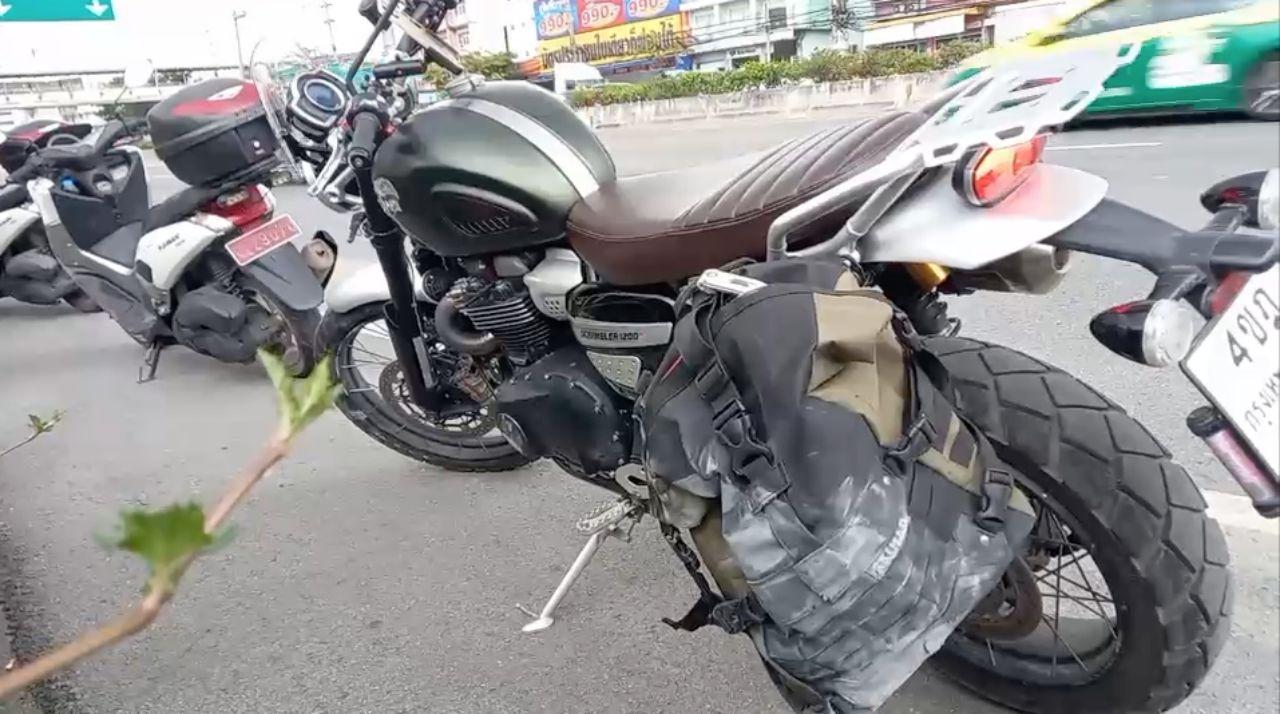 ตรวจค้นในตัวพบเงินสด 360 บาท จึงเก็บไว้เป็นหลักฐาน ตรวจสอบบนสะพานข้ามแยก ซึ่งเป็นช่วงโค้งมุ่งหน้าถนนพระราม 2 ฝั่งขาออก พบรั้วกั้นขอบทางถูกเฉี่ยวชน มีสีเขียวขี้มาติดอยู่ ห่างไปประมาณ 800 เมตร เกือบถึงพื้นถนนพระราม 2 พบรถจักรยานยนต์ไทรอัมพ์ รุ่น สแครมเบลอร์ ขนาด 1,200 ซีซี สีเขียวขี้ม้า ทะเบียน 4ขฎ 4411 กรุงเทพมหานคร ตะแคงพิงรั้วกั้นทางด้านซ้าย สภาพด้านซ้ายมีรอยเฉี่ยวชนทั้งแถบ