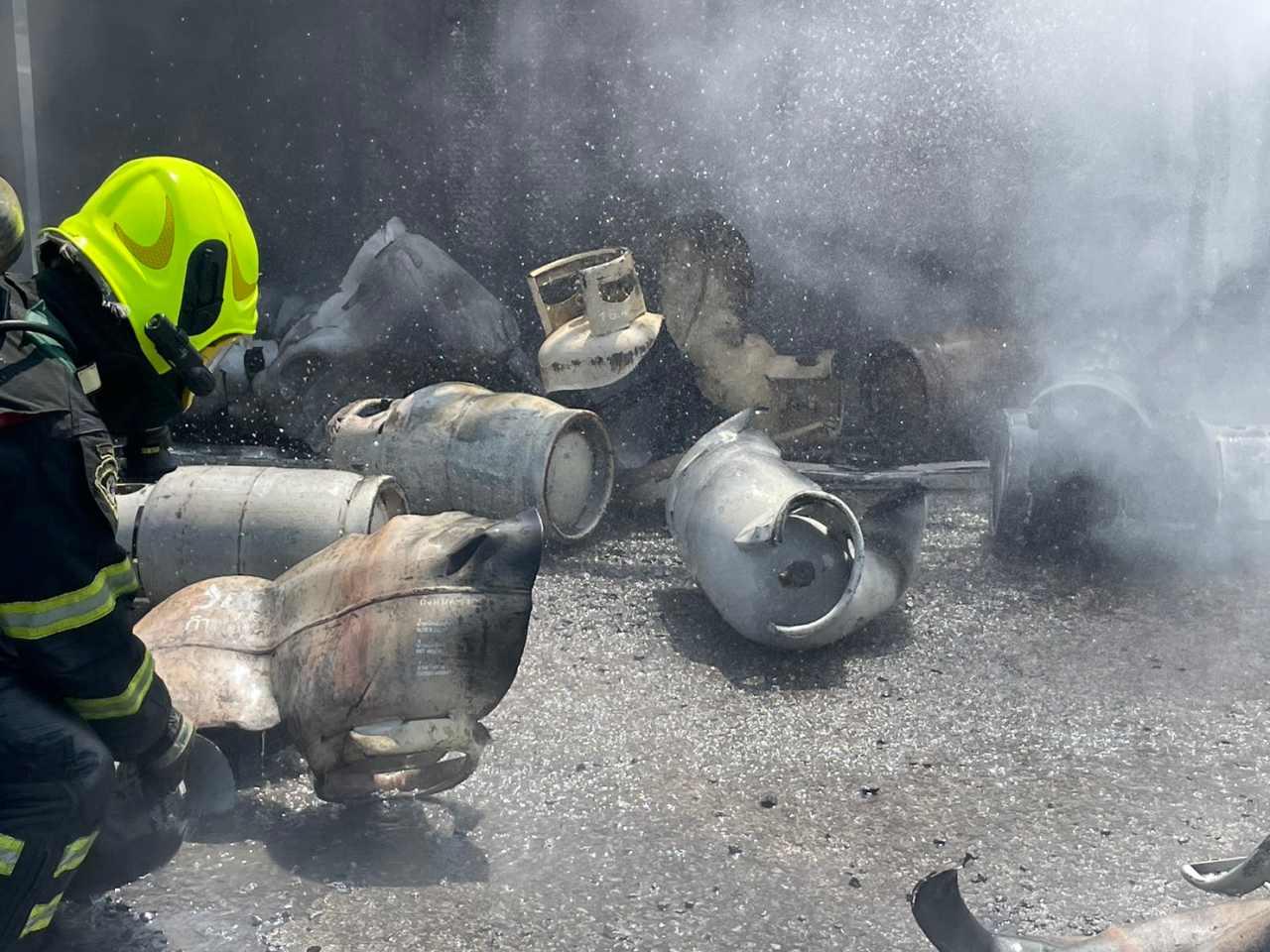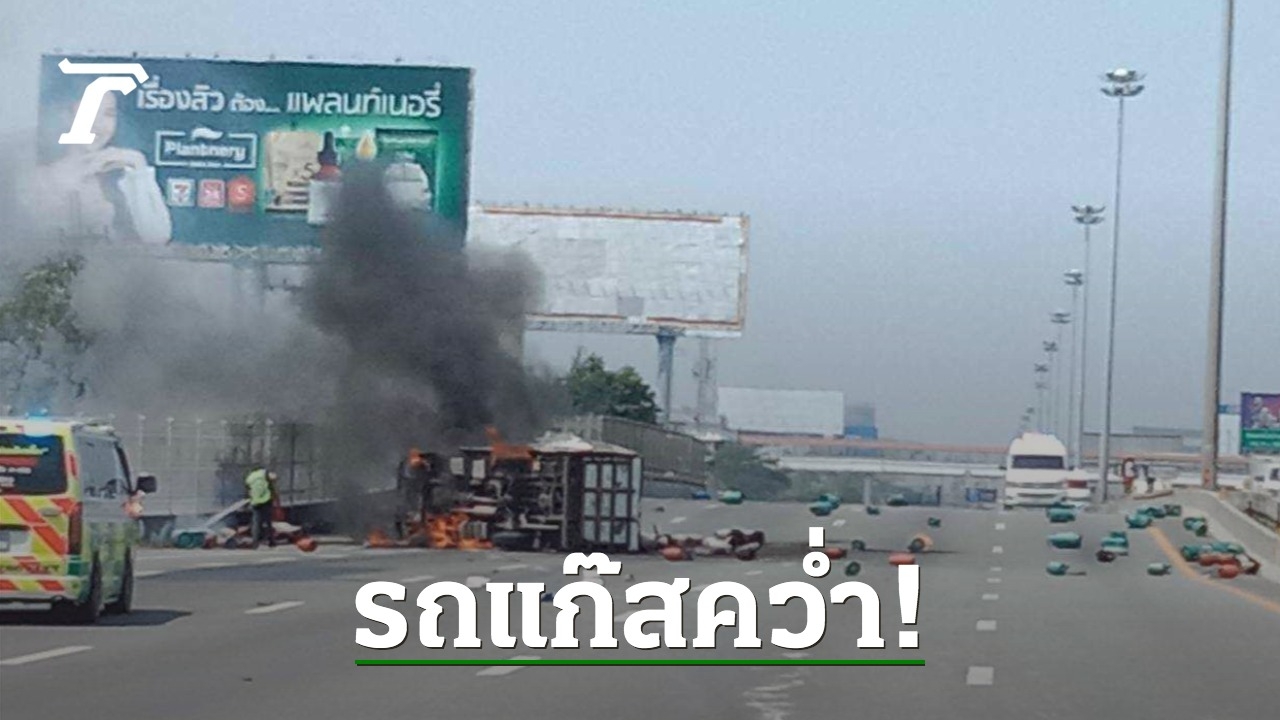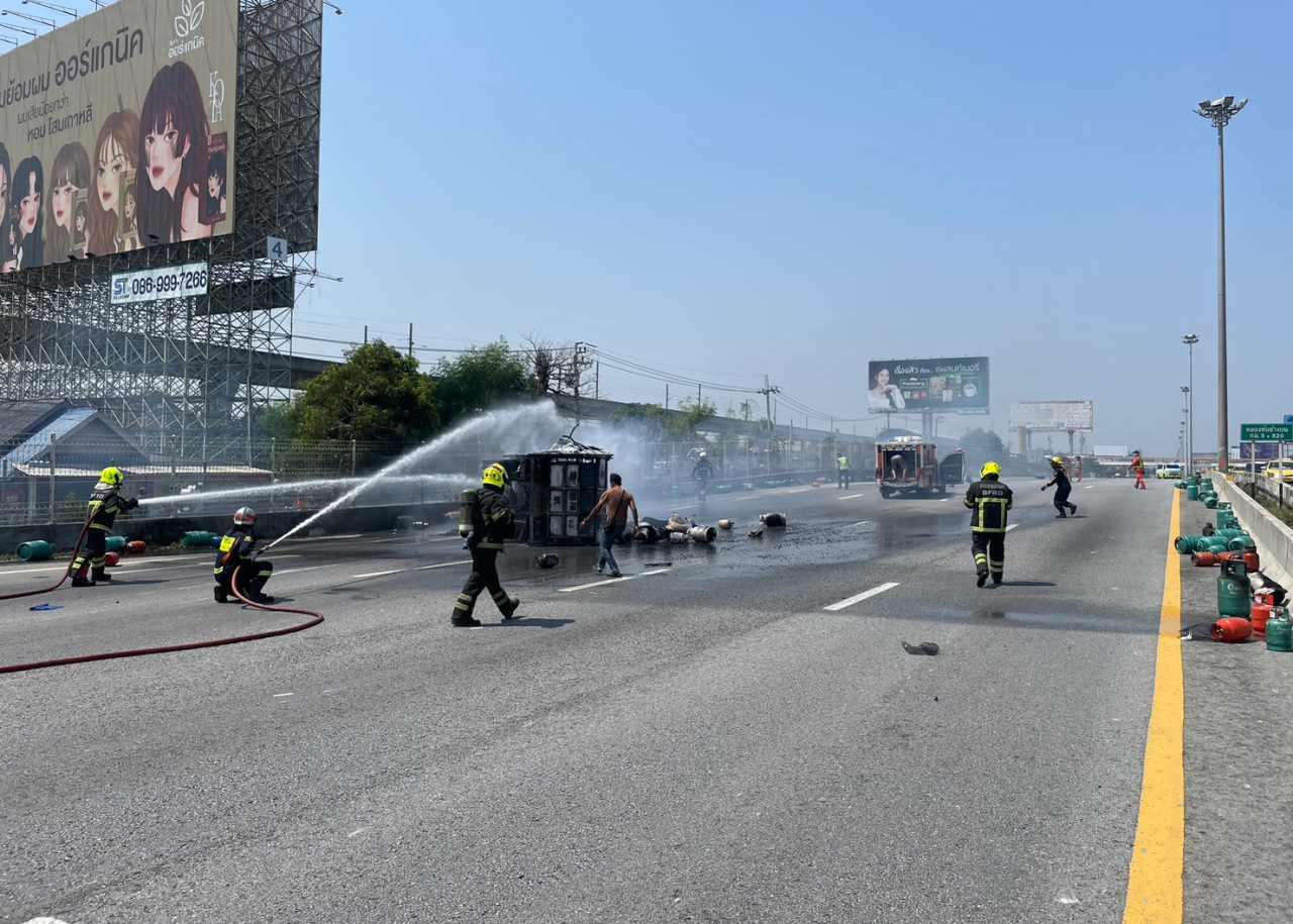 รถสี่ล้อเล็กบรรทุกถังแก๊สหุงต้ม พลิกคว่ำระเบิดไฟลุกกลางถนนมอเตอร์เวย์ ช่วง กม.5+900 ขาเข้า กทม. มีผู้บาดเจ็บสาหัสเป็นชาย 1 ราย จนท.เร่งดับเพลิง เคลื่อนย้ายสิ่งกีดขวาง