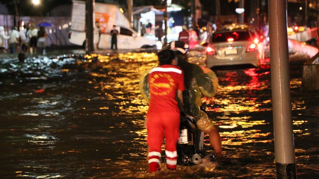 ส่วนที่ ถนนรัชดาภิเษก ถือว่าวิกฤติสุด ระดับน้ำรอการระบาย สูงเกือบ 50 เซนติเมตร แรงกระแทกของคลื่นน้ำจากรถยนต์เวลาวิ่งผ่าน ทำให้แบริเออร์กระจัดกระจายล้มกีดขวางช่องทางจราจร ขณะที่รถยนต์ และรถจักรยานยนต์หลายคัน เครื่องยนต์ดับระหว่างทาง เจ้าหน้าที่กู้ภัยเพชรเกษมกรุงเทพฯ ต้องคอยอำนวยความสะดวกช่วยเหลือประชาชน พร้อมประชาสัมพันธ์ให้หลีกเลี่ยงเส้นทางที่ถูกน้ำท่วมขังสูง