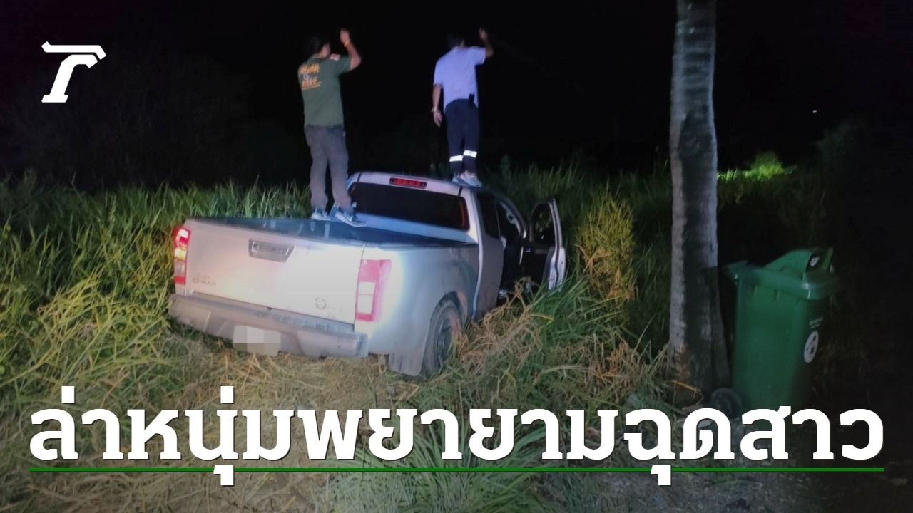 หนุ่มเมาพยายามฉุดสาวขึ้นรถ แต่สาวโชคดีวิ่งหนีมาได้ รุดแจ้ง จนท.ตามจับ-ขับรถไล่ล่าระทึก 3 พื้นที่ 3 สน. สุดท้ายไม่รอด รถเสียหลักพุ่งเข้าป่าหญ้าข้างทาง ตำรวจตามตะครุบตัวได้สำเร็จ