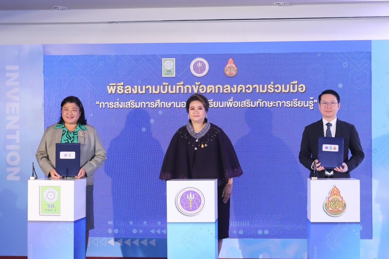นอกจากนี้ วช. ยังได้จัดพิธีลงนามบันทึกข้อตกลงความร่วมมือ “การส่งเสริมการศึกษานอกห้องเรียน เพื่อเสริมสร้างทักษะการเรียนรู้” ระหว่าง สำนักงานการวิจัยแห่งชาติ (วช.) และ สำนักงานคณะกรรมการการศึกษาขั้นพื้นฐาน (สพฐ.) โดย ดร.วิภารัตน์ ดีอ่อง ผู้อำนวยการสำนักงานการวิจัยแห่งชาติ และนายภูริวรรษ คำอ้ายกาวิน ปฏิบัติหน้าที่ผู้อำนวยการสำนักบริหารงานความเป็นเลิศด้านวิทยาศาสตร์ศึกษา ผู้แทนจากสำนักงานคณะกรรมการการศึกษาขั้นพื้นฐาน ร่วมลงนามบันทึกข้อตกลงความร่วมมือ โดยมี นางสาวศุภมาส อิศรภักดี รัฐมนตรีว่าการกระทรวง อว. เป็นประธาน ความร่วมมือครั้งนี้จะก่อให้เกิดการส่งเสริม ผลักดัน การเพิ่มพูนประสบการณ์ในการเรียนรู้และพัฒนาทักษะของเยาวชน โดยเน้นประสบการณ์เรียนรู้นอกห้องเรียน การสร้างแรงจูงใจในการเรียน เพิ่มพูนประสบการณ์ในการเรียนรู้ และพัฒนาทักษะที่สำคัญ รวมถึงทักษะการสังเกต การตั้งคำถาม การคิดเชิงวิจารณญาณ การแก้ปัญหา ทักษะการสื่อสาร การทำงานร่วมกัน และพัฒนาความคิดสร้างสรรค์ และปลูกฝังคุณลักษณะของการเป็นผู้ใฝ่เรียนรู้ตลอดช่วงชีวิต.