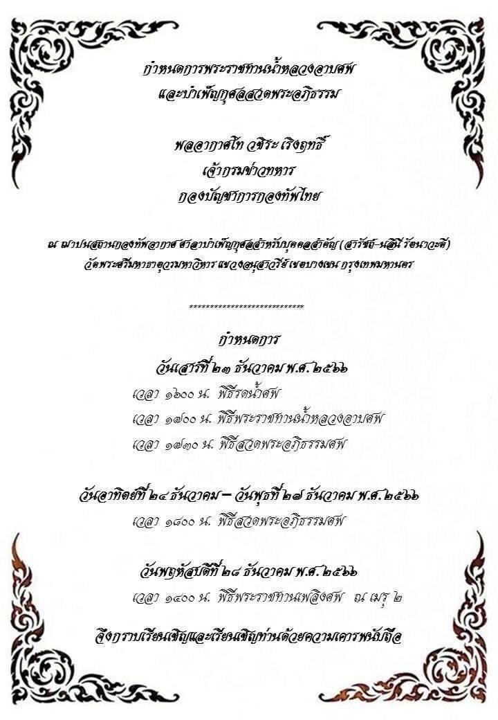 "กองทัพไทย" แจ้งพิธีพระราชทานน้ำหลวงอาบศพ "เจ้ากรมข่าวทหาร" และพิธีสวดพระอภิธรรมศพ จากการเสียชีวิตอย่างกะทันหันระหว่างขับรถกลางถนนวิภาวดีเมื่อวานนี้ ทั้งนี้ "ผบ.ทสส." ได้สั่ง บก.ทท. จัดงานให้ "พล.อ.ท.วชิระ เริงฤทธิ์" อย่างสมเกียรติด้วย