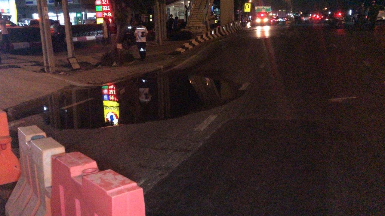 นายสนธยา ศรีนวล รอง ผอ.แขวงทางหลวงธนบุรี กล่าวว่า จุดเกิดเหตุ เป็นพื้นที่ของแขวงการทางธนบุรี โดยการประปานครหลวงได้มีการขออนุญาตดำเนินการวางท่อประปา อุโมงค์ส่งน้ำ ลึกลงไป 25 เมตรจากพื้นถนน โดยอุโมงค์ดังกล่าวมีความกว้างขนาด 3 เมตร โดยเหตุที่เกิดเพราะว่าการขุดเจาะด้านล่างมีปัญหาทำให้ดินในอุโมงค์ทรุดตัว และไหลออก