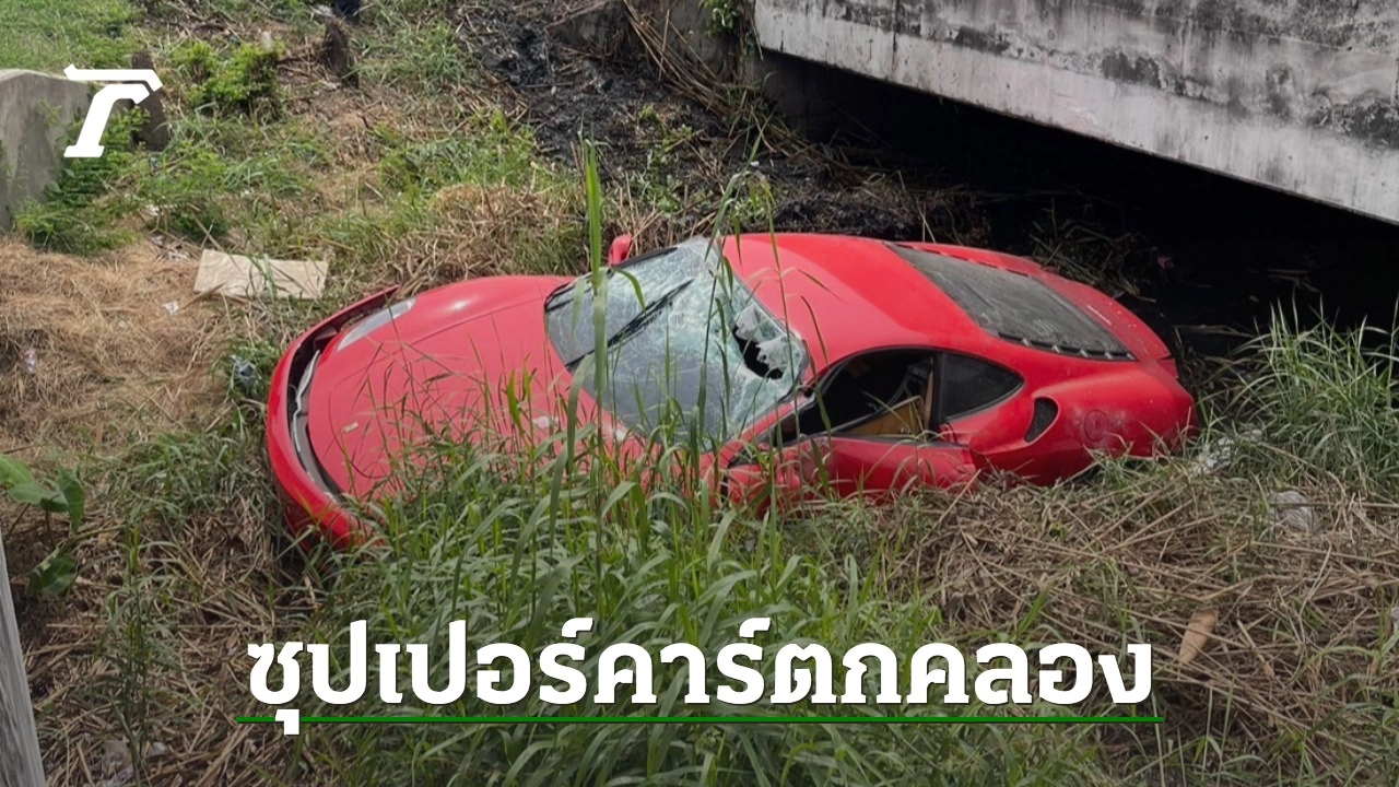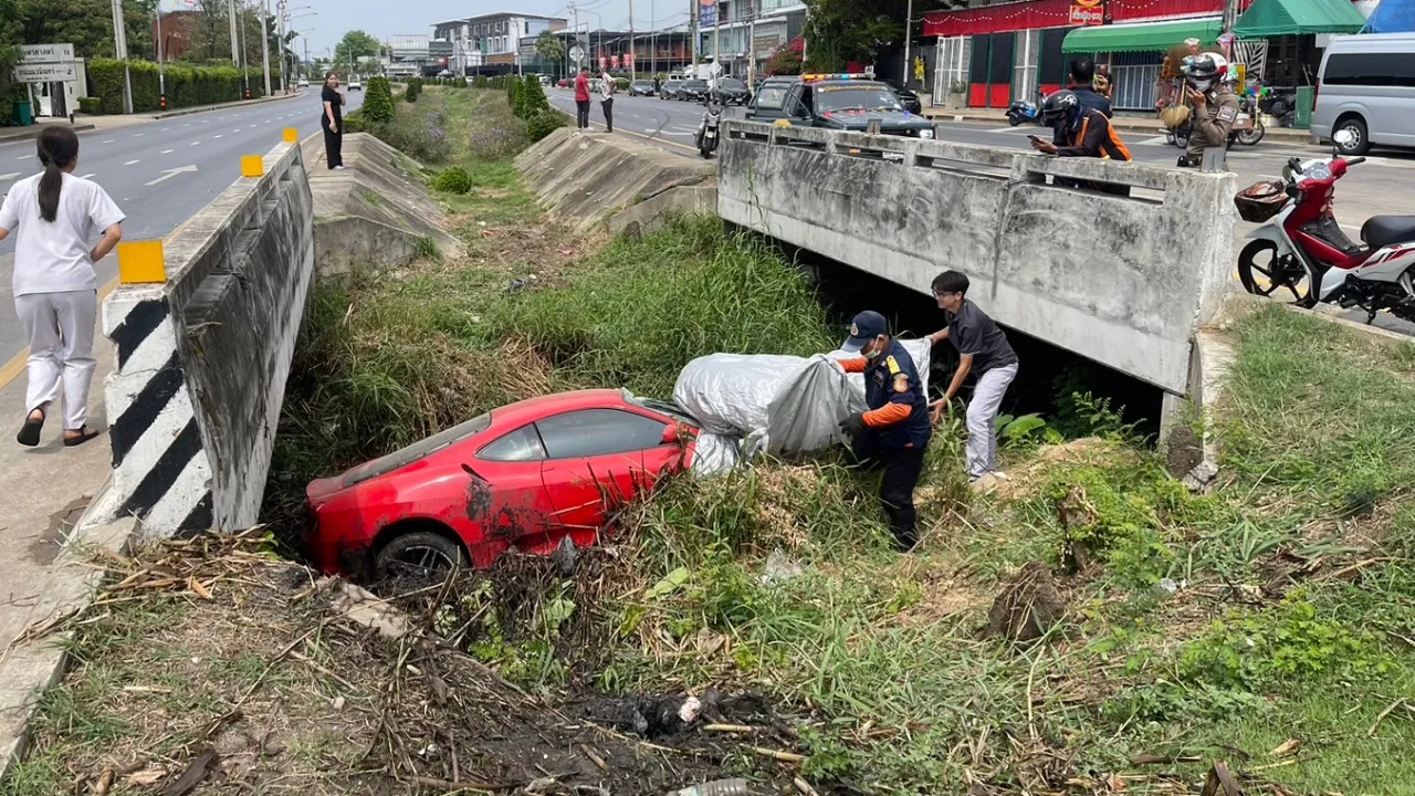เกิดอุบัติเหต ซุปเปอร์คาร์เฟอร์รารี สีแดงสด เสียหลักตกลงในคลองน้ำ ถนนประเสริฐมนูกิจ แขวงคันนายาว กทม. ท้องที่ สน.บึงกุ่ม ประตูด้านซ้ายยุบ กันชนหน้าหลุด คนขับเป็นหนุ่มวัยฉกรรจ์บาดเจ็บเล็กน้อย ทราบว่านำรถที่เพิ่งซ่อมเสร็จจากอู่ออกมาทดลองขับ