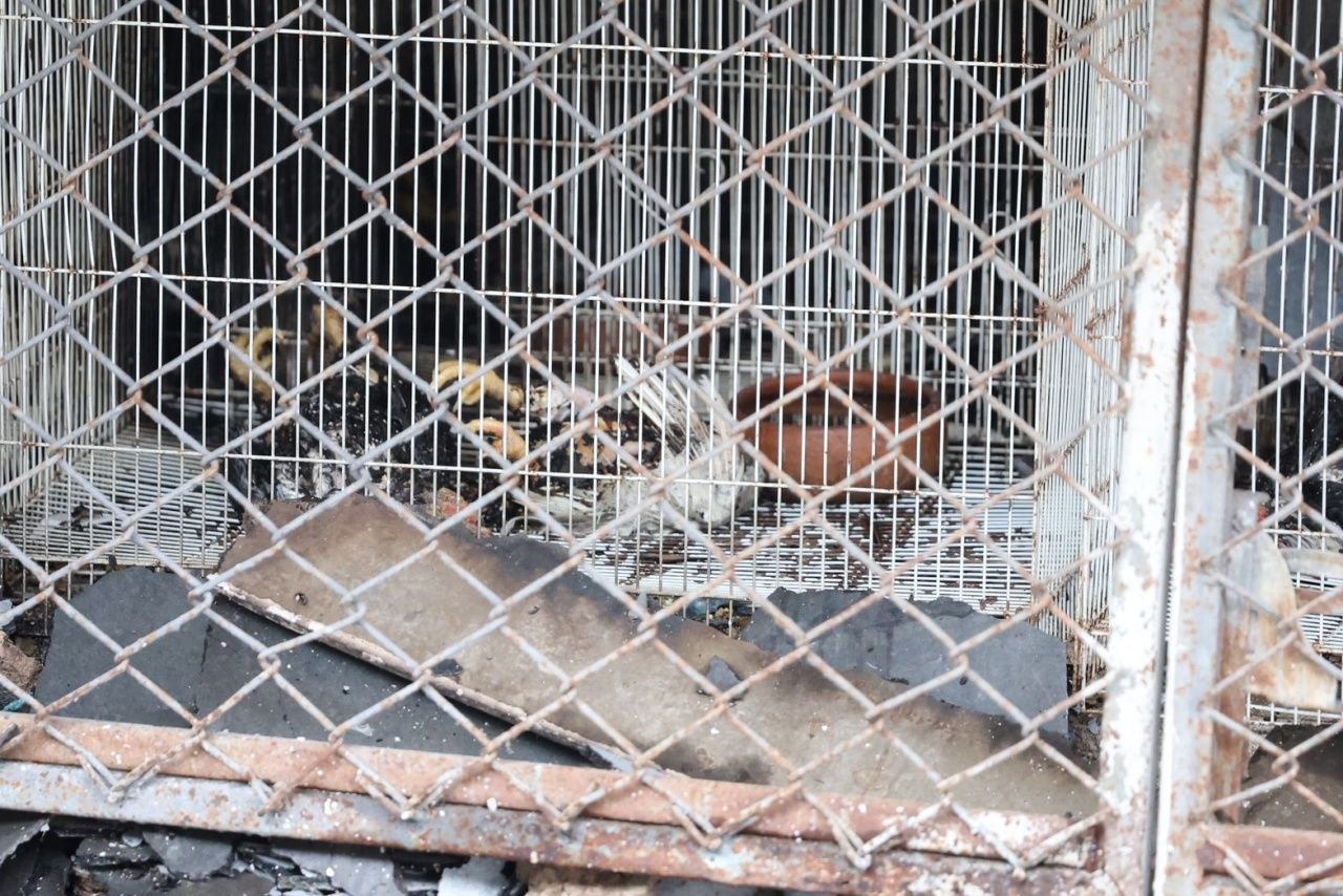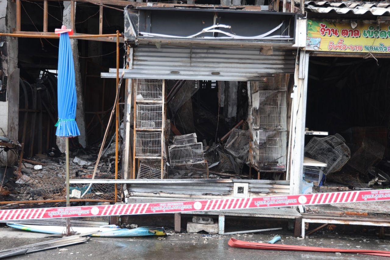 เจ้าหน้าที่ พฐ.ตรวจไฟไหม้ร้านขายสัตว์เลี้ยงตลาดศรีสมรัตน์ ตลาดนัดสวนจตุจักร หลังเกิดเพลิงไหม้คลอกสัตว์เลี้ยงในกรงตายนับร้อยตัว ล่าสุดยังไม่อนุญาตให้เจ้าของร้านเข้าไปดู พบไก่ดวงแข็งรอดชีวิต 1 ตัว นั่งซึมอยู่ในกรงท่ามกลางซากเพื่อน ด้าน กทม.เยียวยาผู้เสียหาย เบื้องต้น จ่ายผู้ประกอบการรายละ 11,400 บาท