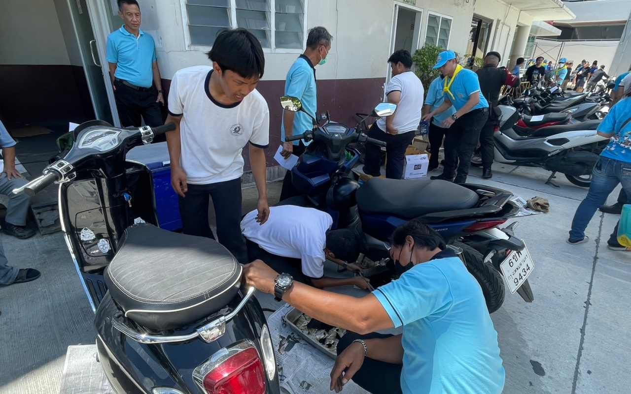 สน.หัวหมาก ร่วมกับ คณะ กต.ตร.สน.หัวหมาก และวิทยาลัยช่างอุตสาหกรรมกรุงเทพ จัดกิจกรรมจิตอาสา เปลี่ยนถ่ายน้ำมันเครื่องและตรวจสภาพรถ จยย. เบื้องต้น ให้กับประชาชนทั่วไปและตำรวจ สน.หัวหมาก ฟรี