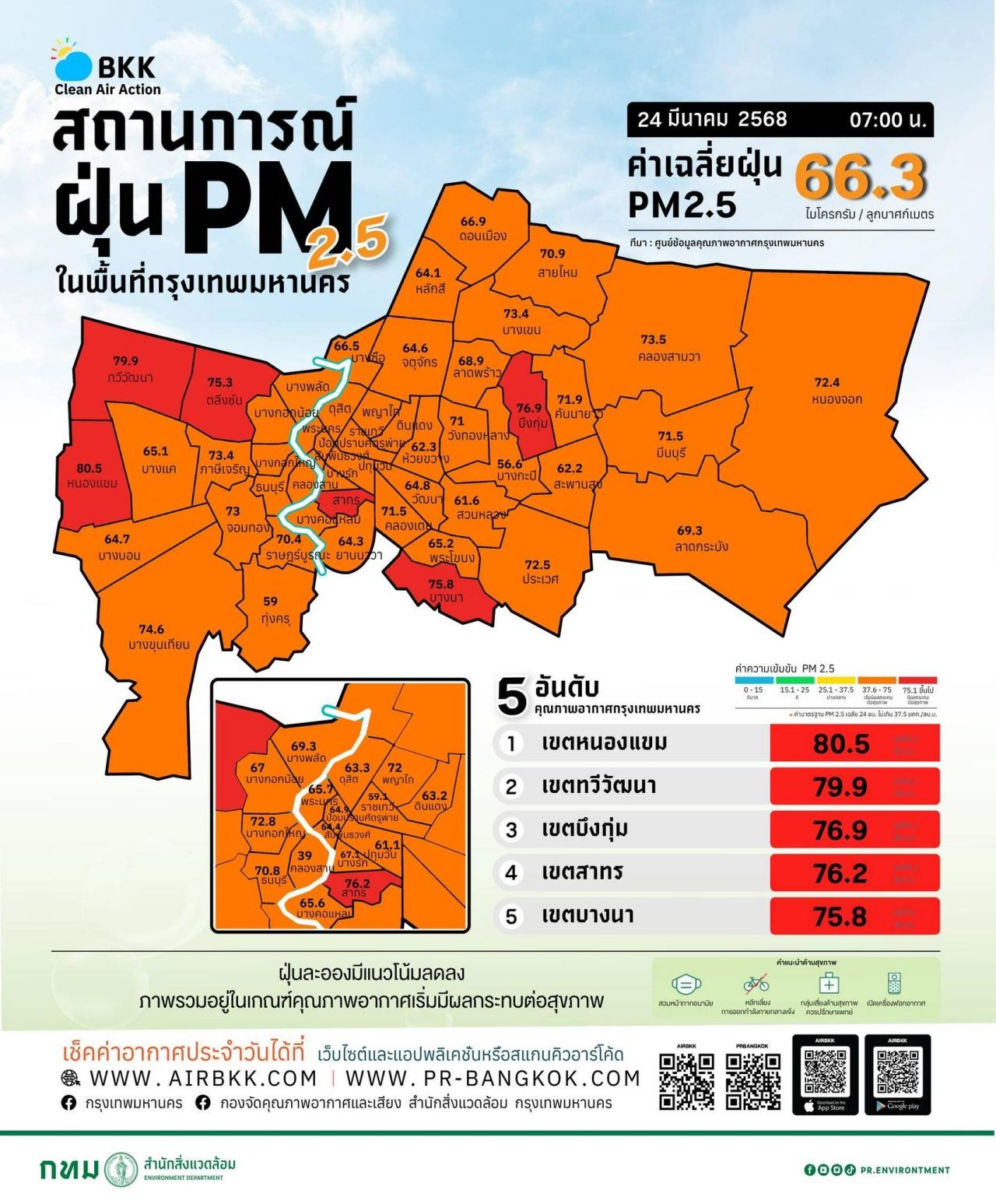 วันที่ 24 มี.ค. 68 ศูนย์ข้อมูลคุณภาพอากาศกรุงเทพมหานคร รายงานสถานการณ์ฝุ่นละอองขนาดไม่เกิน 2.5 ไมครอน (PM 2.5) ของสถานีตรวจวัดคุณภาพอากาศของกรุงเทพมหานคร เมื่อเวลา 07.00 น. ค่าเฉลี่ย 24 ชั่วโมง ของฝุ่นละอองขนาดไม่เกิน 2.5 ไมครอน (PM2.5) ตรวจวัดได้ 39-78 ไมโครกรัม/ลูกบาศก์เมตร (มคก./ลบ.ม.) พบว่าเกินมาตรฐานอยู่ในระดับสีแดง มีผลกระทบต่อสุขภาพ (มาตรฐาน 75.1 มคก./ลบ.ม.ขึ้นไป) จำนวน 5 พื้นที่ คือ
