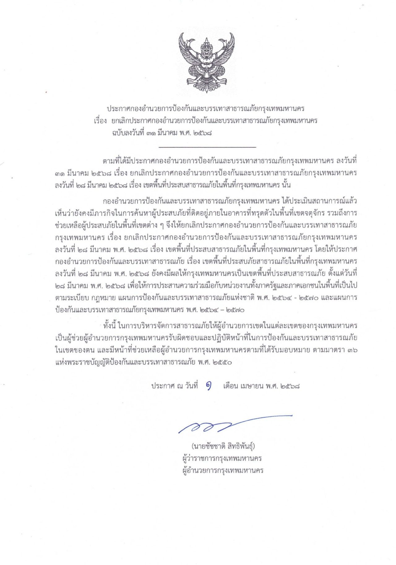 ตามที่ได้มีประกาศกองอำนวยการป้องกันและบรรเทาสาธารณภัยกรุงเทพมหานคร ลงวันที่ 31 มีนาคม 2568 เรื่อง ยกเลิกประกาศกองอำนวยการป้องกันและบรรเทาสาธารณภัยกรุงเทพมหานคร ลงวันที่ 28 มีนาคม 2568 เรื่อง เขตพื้นที่ประสบสาธารณภัยในพื้นที่กรุงเทพมหานคร นั้น