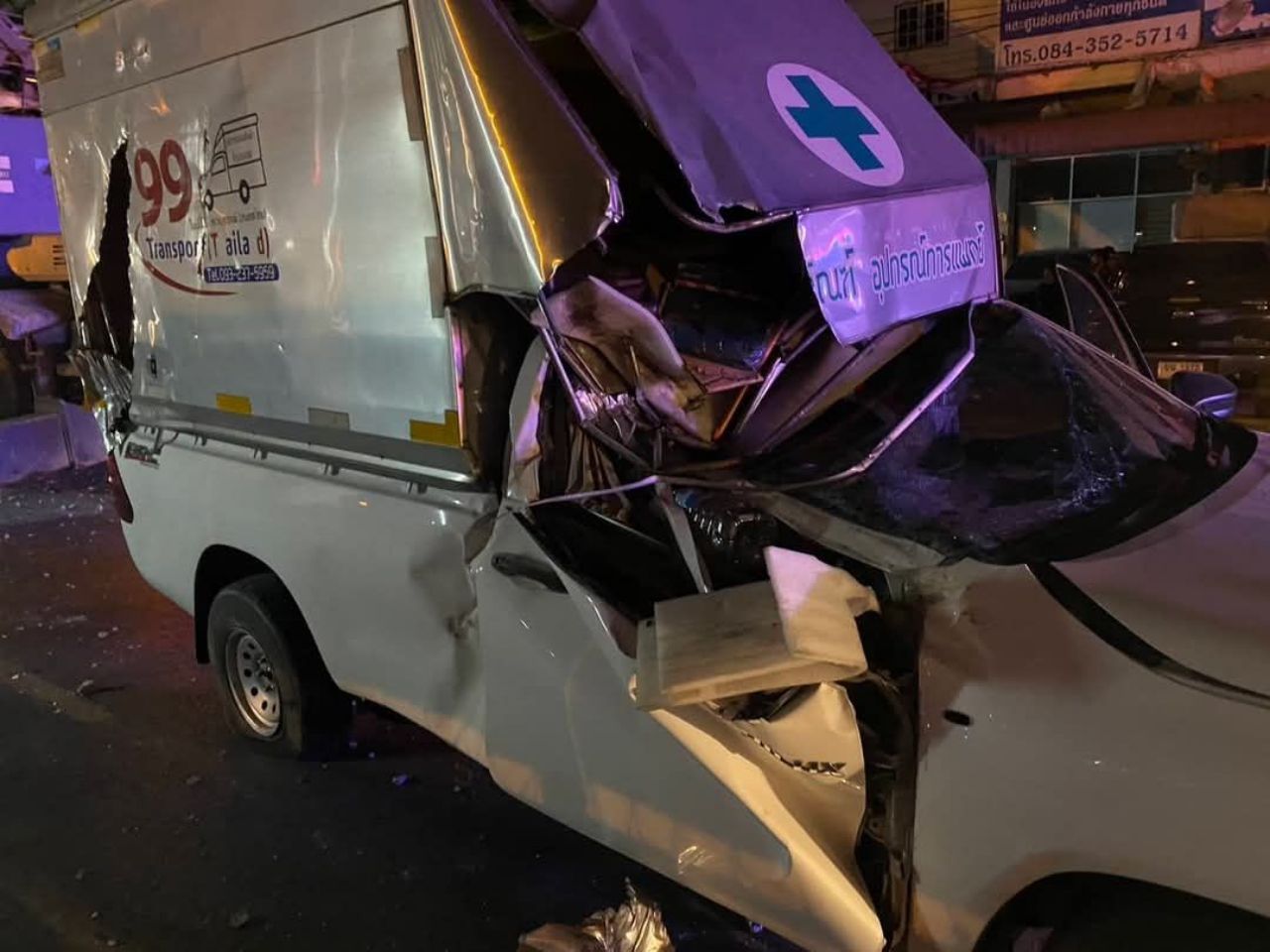 เหตุระทึกบนถนนพระราม 2 เกิดซ้ำอีก หลังรถเครนกำลังยกรถ 6 ล้อ เกิดสลิงขาด ร่วงตกจากทางด่วนที่กำลังก่อสร้าง ทับกระบะตู้ทึบพังยับ เจ็บ 1 ราย