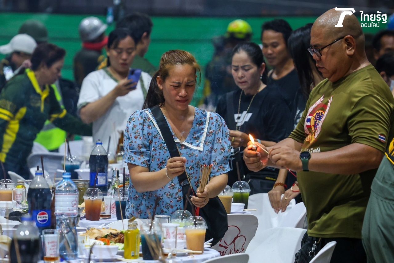 ซึ่งเมื่อสักครู่ที่ผ่านมา ได้ไปไหว้ปู่ย่าตายายพระภูมิเจ้าที่ รวมถึงพระสยามเทวาธิราชสิ่งศักดิ์สิทธิ์ทั้งหลาย เพื่อให้เปิดทางขอให้ผู้เสียชีวิตจากเหตุการณ์ดังกล่าวออกมารับประทานอาหาร โดยพิธีการจะเริ่มด้วยการนิมนต์พระอาจารย์มาทำการเปิดพื้นที่ และอ่านรายชื่อผู้เสียชีวิต เพื่อเป็นการอัญเชิญดวงวิญญาณ ก่อนเผากระดาษรายชื่อ และนำธูปไปปักตามจานอาหารที่เตรียมไว้