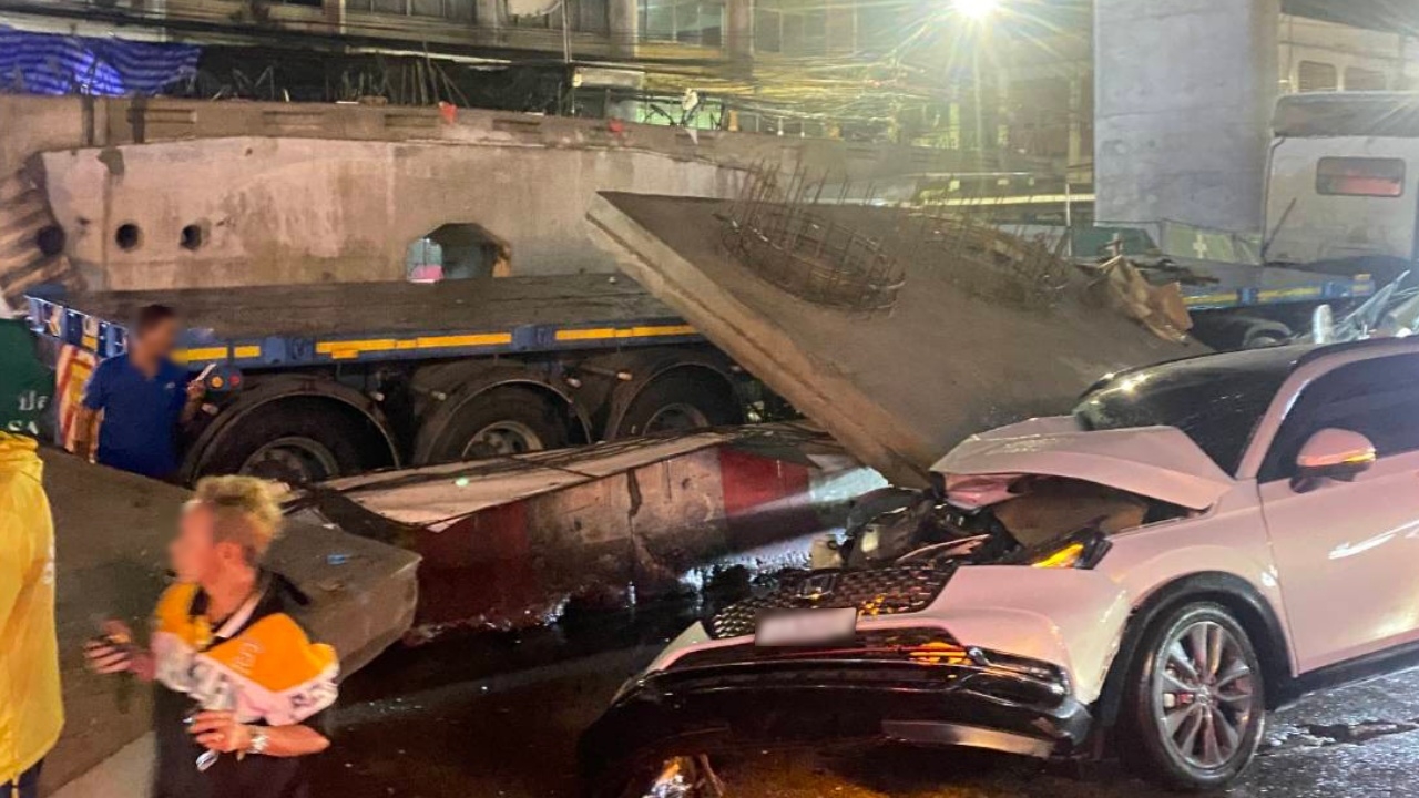ในที่เกิดเหตุ พบรถยนต์นั่งส่วนบุคคล ยี่ห้อฮอนด้า สีขาว ทะเบียนกรุงเทพมหานคร ถูกแผ่นปูนลักษณะเป็นแผ่นสี่เหลี่ยมขนาดใหญ่หล่นทับกระจกหน้าแตก และฝากระโปรงหน้ารถพังยับเยิน กันชนหน้าหลุด ใกล้กันพบรถบรรทุกพ่วง 18 ล้อ ทะเบียนเพชรบุรี ที่บรรทุกแผ่นปูนดังกล่าว ซึ่งใช้สำหรับก่อสร้างสะพานยกระดับจอดอยู่