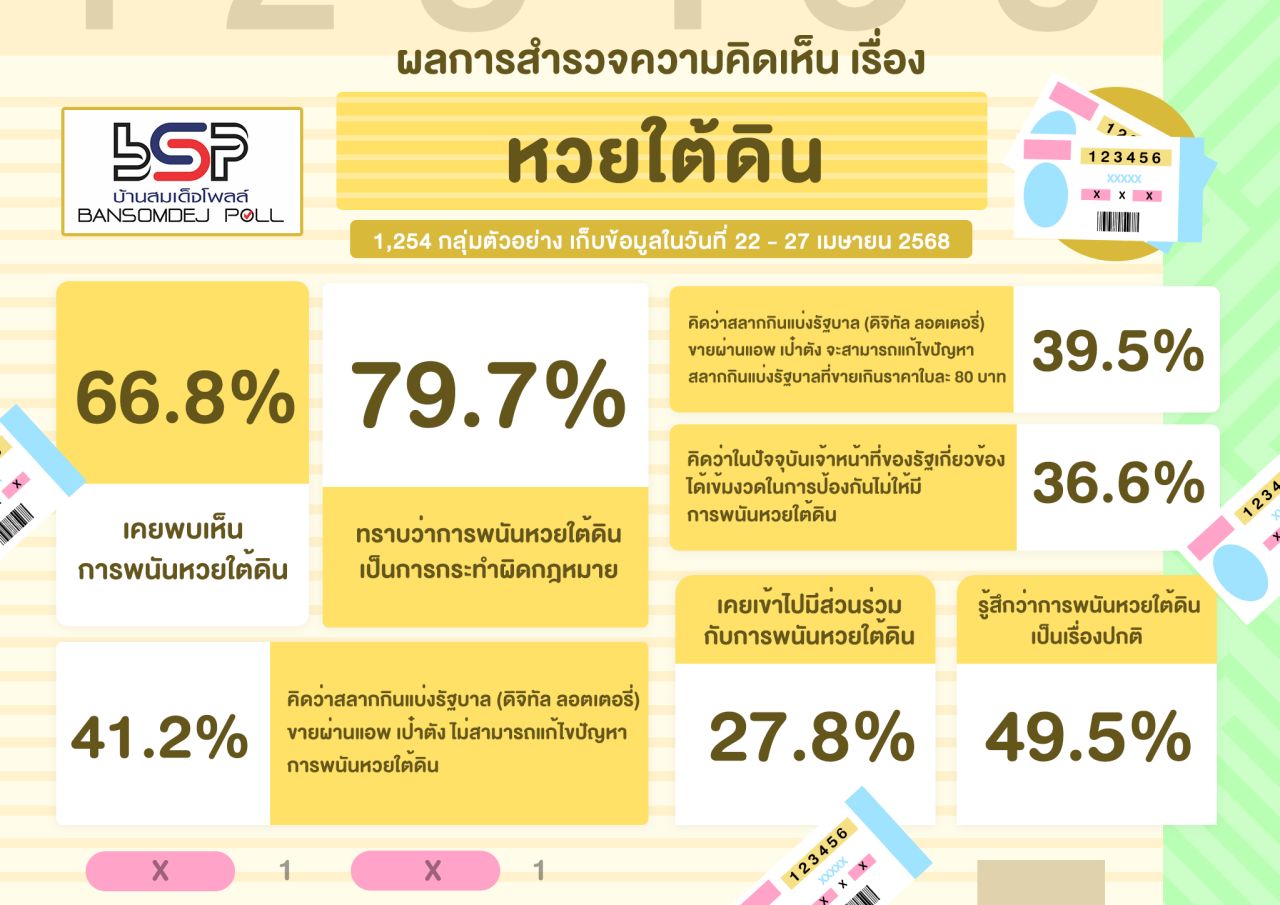 วันที่ 15 พ.ค. 68 ศูนย์สำรวจความคิดเห็นบ้านสมเด็จโพลล์ สถาบันวิจัยและพัฒนา มหาวิทยาลัยราชภัฏบ้านสมเด็จเจ้าพระยา ได้ดำเนินโครงการสำรวจความคิดเห็นเกี่ยวกับ "หวยใต้ดิน" โดยเก็บจากกลุ่มตัวอย่างจากประชาชนที่อาศัยอยู่ในจังหวัดกรุงเทพมหานคร จำนวนทั้งสิ้น 1,254 กลุ่มตัวอย่าง เก็บข้อมูลในวันที่ 22 - 27 เมษายน 2568