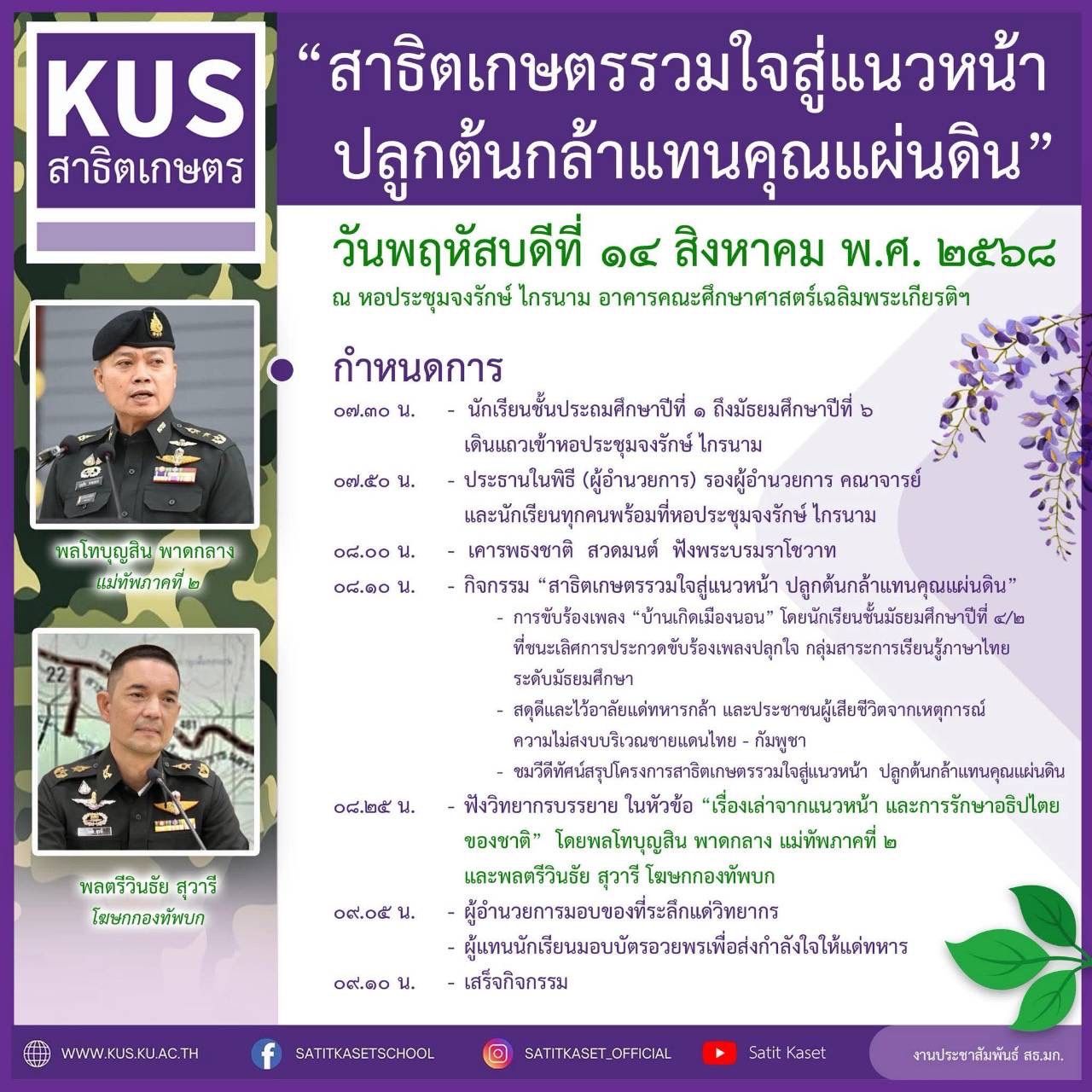 โรงเรียนสาธิตแห่งมหาวิทยาลัยเกษตรศาสตร์ เตรียมจัดกิจกรรม "สาธิตเกษตรรวมใจสู่แนวหน้า ปลูกต้นกล้าแทนคุณแผ่นดิน" วันที่ 14 ส.ค. 68 นี้