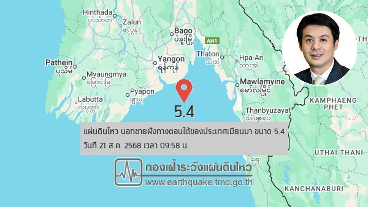 เมื่อเวลาประมาณ 10.00 น. วันที่ 21 สิงหาคม 2568 เกิดแผ่นดินไหวขนาด 5.4 ที่นอกชายฝั่งเมียนมา โดยจุดศูนย์กลางที่ระดับความลึกประมาณ 10 กม. ศ.ดร.อมร พิมานมาศ นายกสมาคมวิศวกรโครงสร้างแห่งประเทศไทย อธิบายว่า แผ่นดินไหวดังกล่าวคาดว่าน่าจะเกิดจากรอยเลื่อนสะกาย แต่จุดที่เกิดเหตุเป็นคนละจุดกับแผ่นดินไหวขนาด 7.7 เมื่อวันที่ 28 มีนาคม 2568 ที่ผ่านมา
